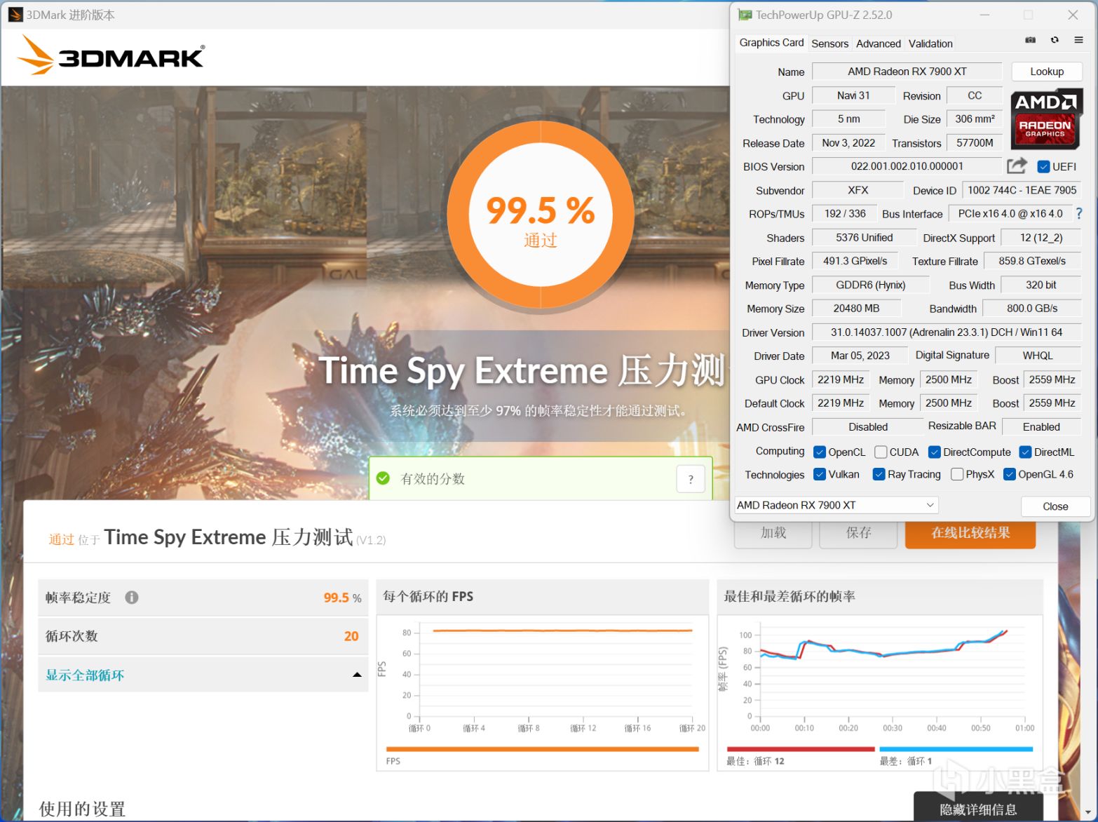 RX 7900 XT海外版Pro运行3DMark Time Spy Extreme压力测试二十轮末的时候,GPU最高温度仅仅只有57℃,运行频率可以达到2643Mhz