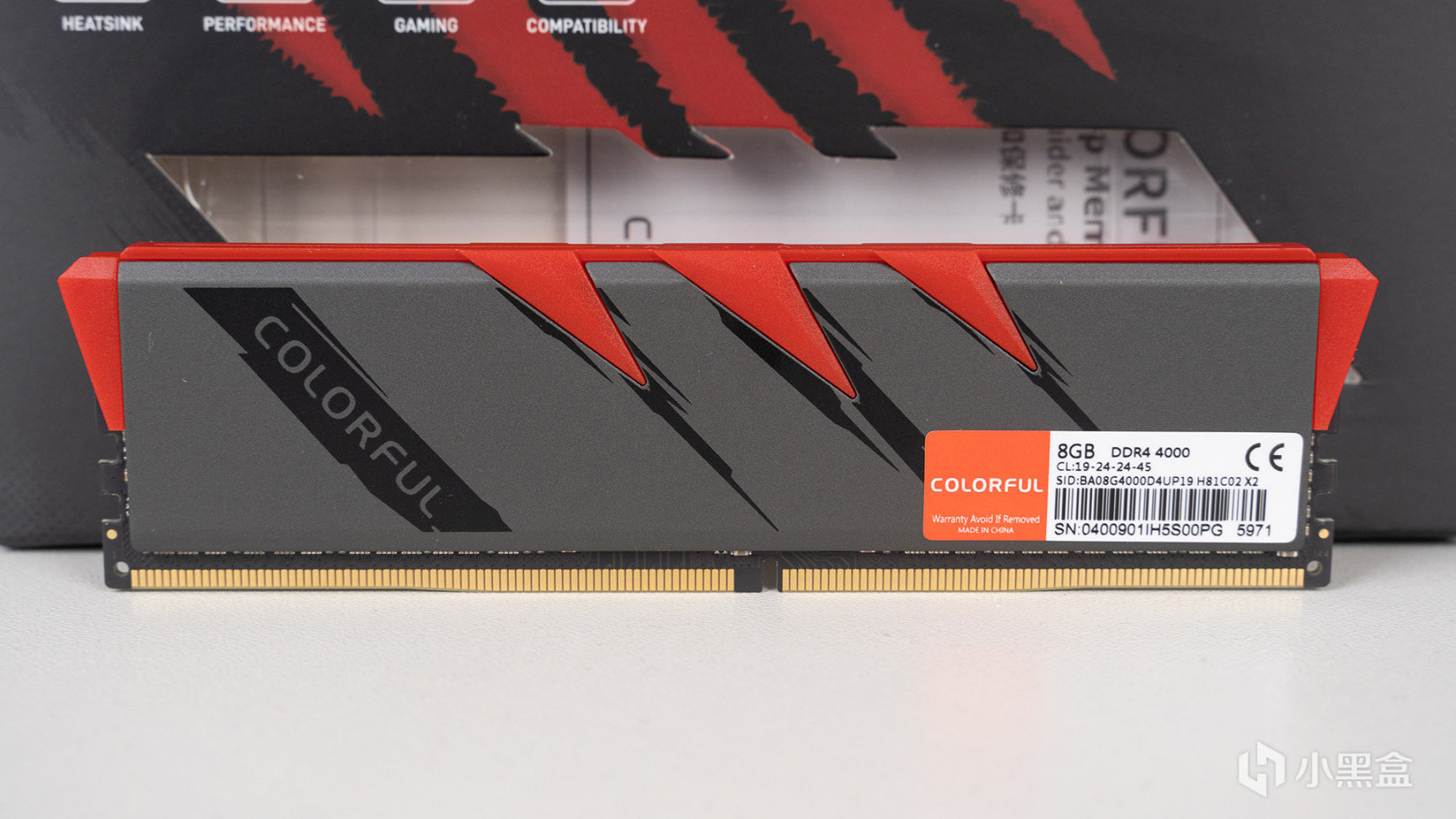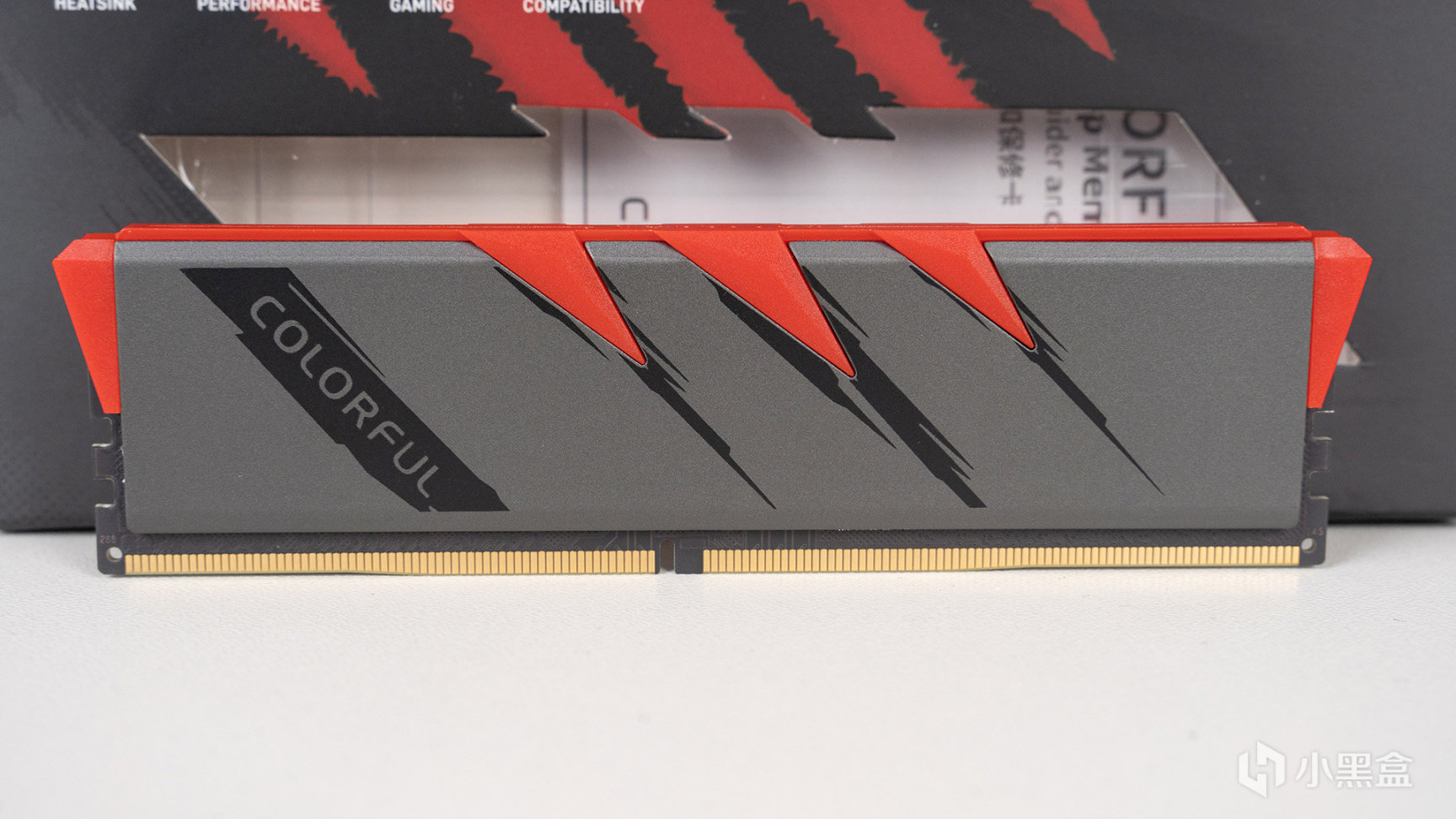 侧面区域,为了表现赤炎的张力,内存的红色装饰模块是向外凸出的,立体感更足,散热马甲上有COLORFUL LOGO,另外内存因为没有设计LED灯,高度控制得也不错。