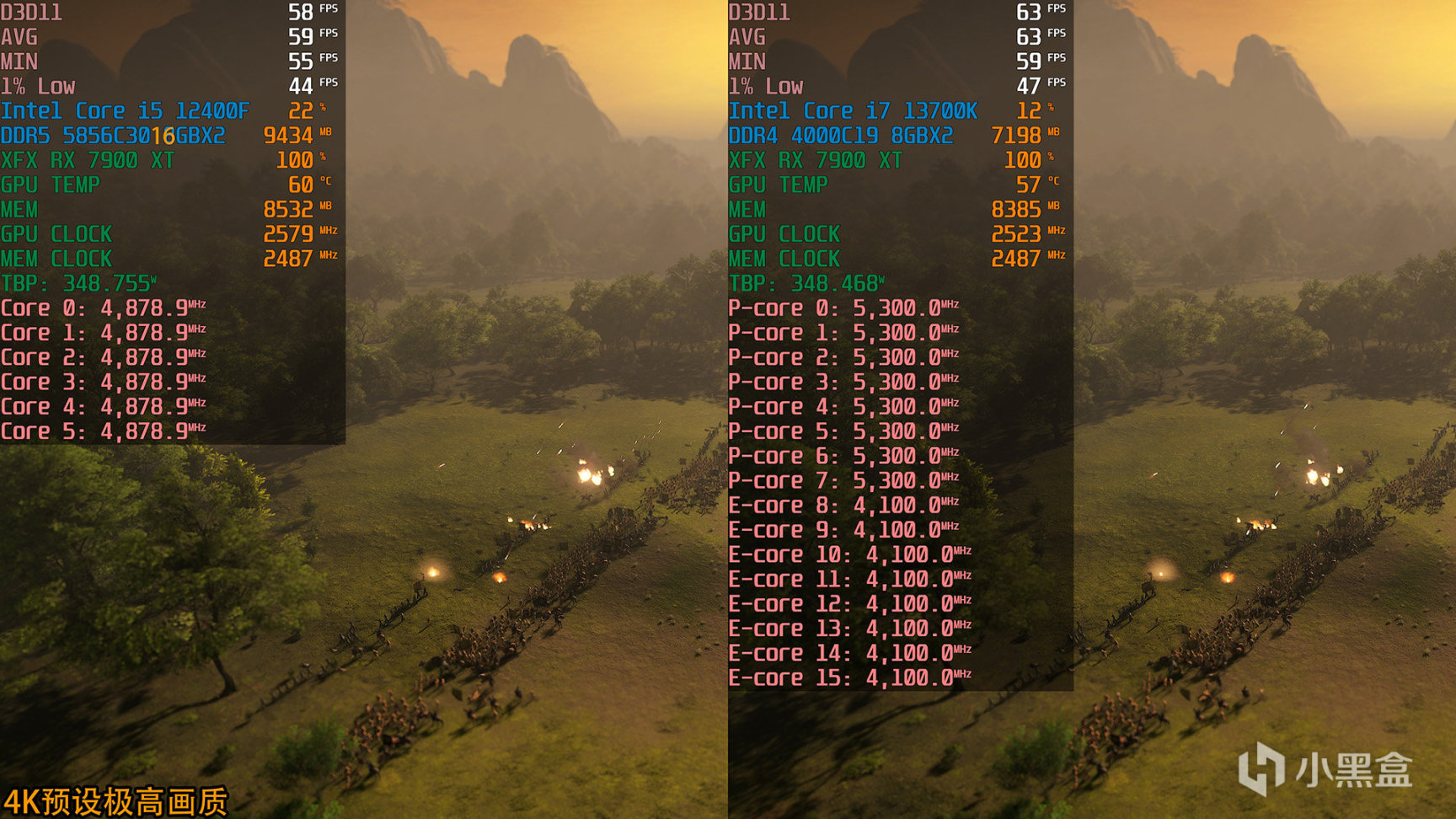 《全面战争:三国》4K分辨率预设非常高画质,i5-12400F+RX 7900 XT海外版Pro平均帧数为59fps,i7-13700K+RX 7900 XT海外版Pro平均帧数为63fps