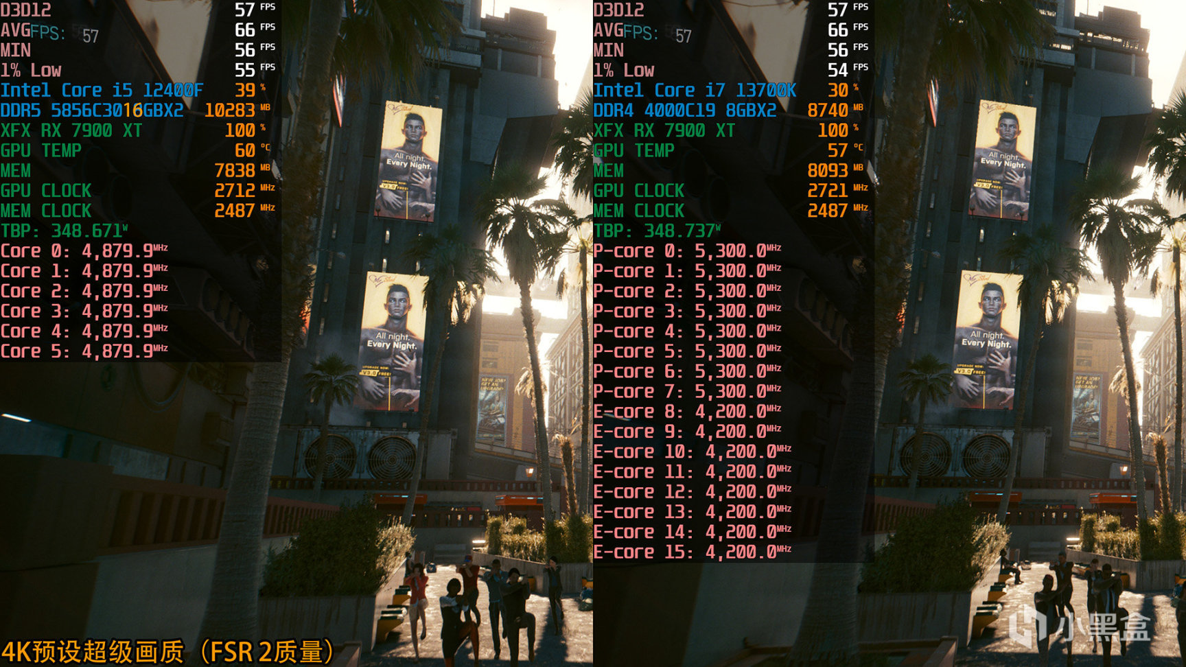 《赛博朋克2077》4K分辨率预设超级画质(FSR 2质量),i5-12400F+RX 7900 XT海外版Pro平均帧数为66fps,i7-13700K+RX 7900 XT海外版Pro平均帧数为66fps