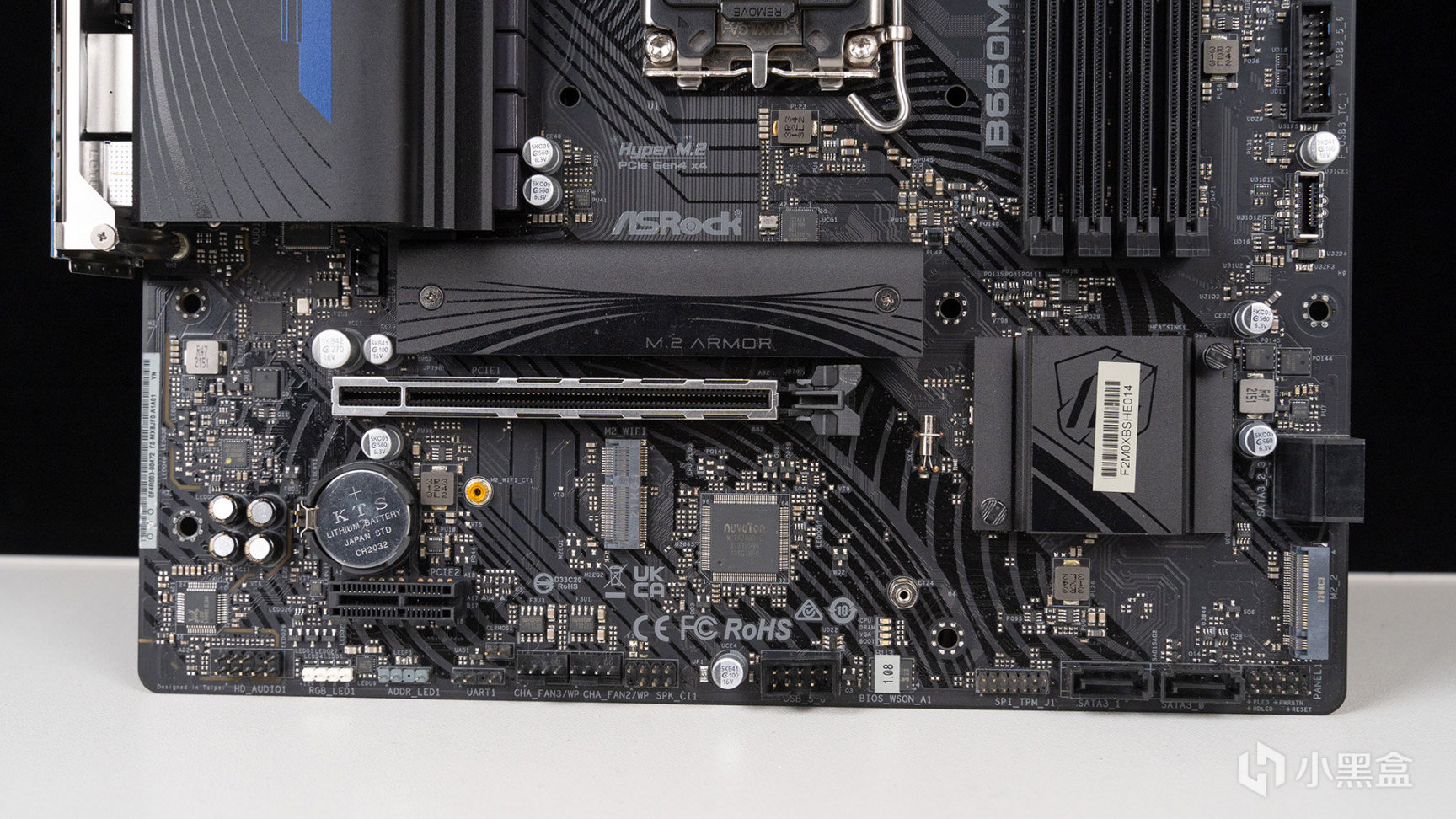 B660M PG Riptide在扩展槽方面支持也是高度相似,第一根钢制加固插槽就是PCIe 4.0X16,中间也有M.2插槽也是支持Key E & 2230类型的WiFi模块,而PCIeX1插槽则是3.0的。两个存储M.2插槽则是没有变化,都是最高支持PCIe 4.0X4。