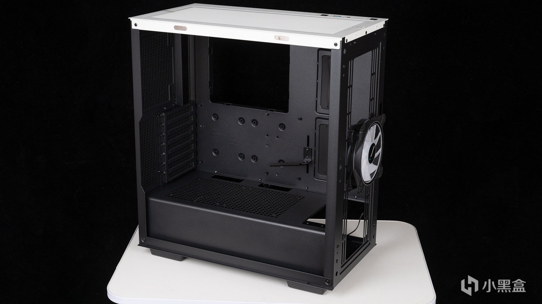 内部设计还是很常见的,它拥有主流ATX机箱的扩展性、兼容性,其中有一些亮点之处,它内置了一个简易式显卡支架(可调整高度),支持显卡竖装模式,背部的SSD安装方式是免工具的,机箱下方能安装2*120mm风扇,不过可惜背部没有标配风扇,说实话这个位置对于散热还是挺关键的。