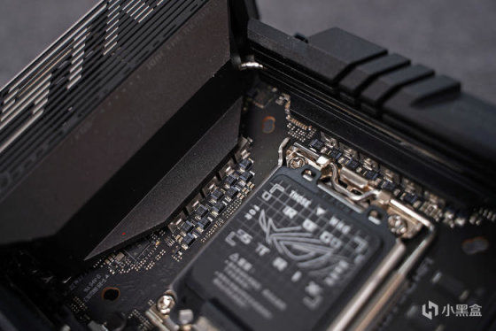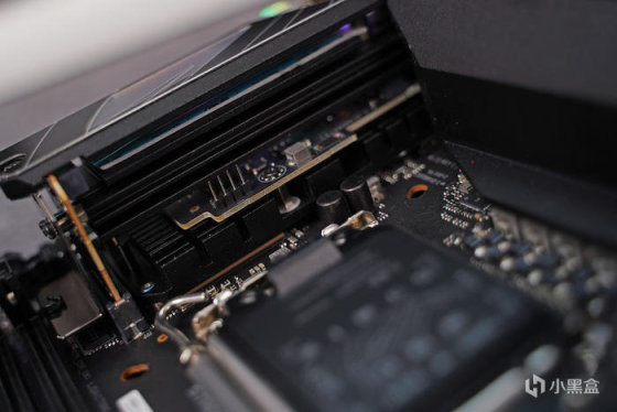 里一个四针 12V 接口,另外这代叠叠乐这次布局做了改进,可见 PCH 芯片在最底下、上层 M.2-2 扩展卡、接着夹心金属散热模块、再 M.2 -1 及顶部的散热模块。