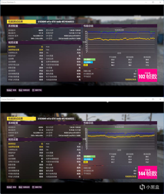 FORZA HORIZON 5,开启光追,BENCH 测试,4K 分辨率,平均 102 FPS ,2K 分辨率,平均 144 FPS。