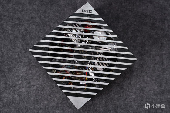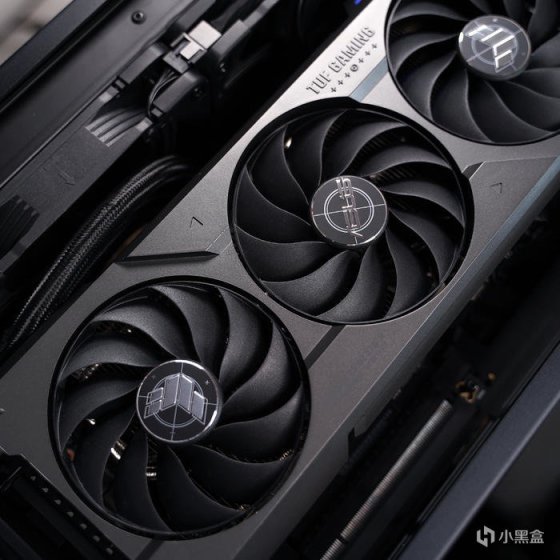 延续这代 TUF 的外观设计,也还是硬朗干练的军事风格,散热马甲全金属材质打造,哑光黑配色,磨砂的质感,表面 TUF GAMING 英文名及华硕总部坐标点缀,搭配了三个 Axial-tech 轴流风扇,支持全高阻隔环,能大幅提升静压,另中间风扇与两侧风扇为正逆转动设计,可以减少空气乱流,提高散热气流利用率,也还必须有的低负载停转技术,给到零噪音的使用体验。