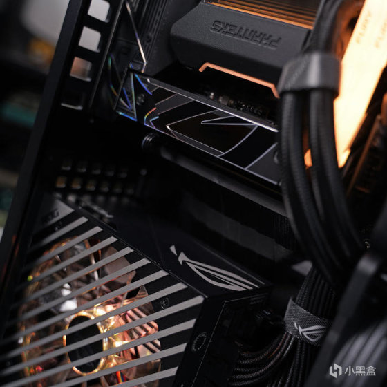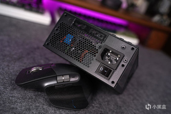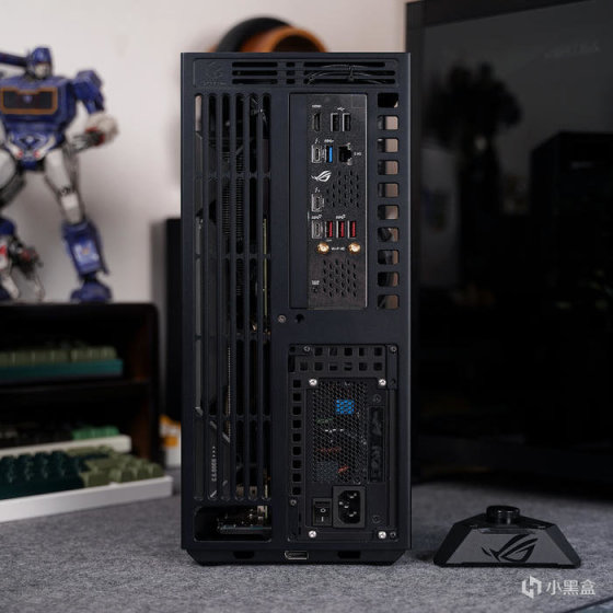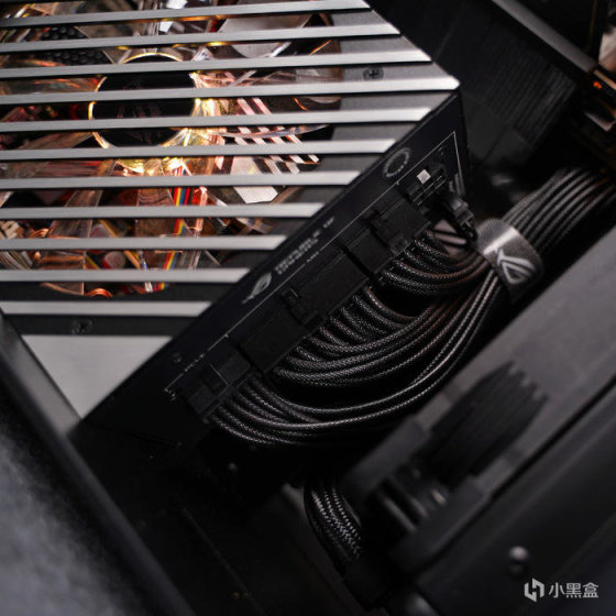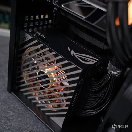电源尾部,位置搭配有一个 败家眼 ROG 点阵铭牌(可透光),其它就常规的 AC 开关,一侧大面积开孔出风设计。