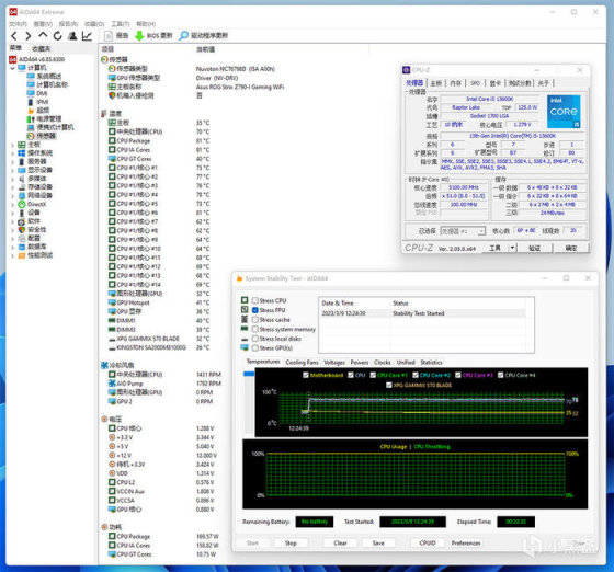 CPU 满载温度表现,AIDA64 单烤 FPU 压力测试,20 分钟左右,P-CORE 温度最大值 81°C,E-CORE 温度最大值 69°C,CPU 显示功耗 170W 左右。