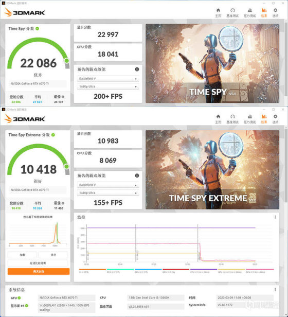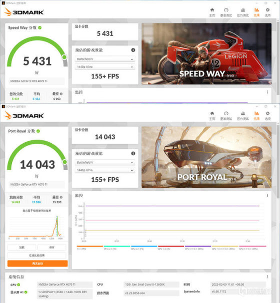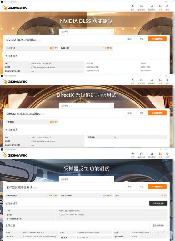 华硕 TUF GAMING RTX 4070TI OC,3DMARK 各种模式下的得分如上。