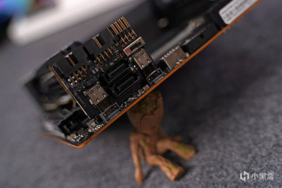 音频接口通过外接 ROG STRIX HIVE 控制器实现,其除了附带常规音频接口外,顶上还带有一个音量控制旋钮,另还配有一个 USB 3.2 Gen2 Type-C 接口和一个 USB 2.0 接口,同时还拥有 BIOS FlashBack、FlexKey、AI 超频按钮,以及 Q-LED 故障诊断灯等,拓展功能的同时,使用起来也会来得更加的方便,可谓牛13的设计。