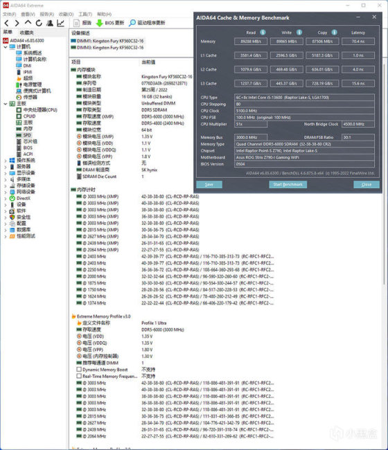 金士顿 FURY Renegade 叛逆者系列 ARGB DDR5 6000 16G×2,内存 AIDA64 跑分表现。
