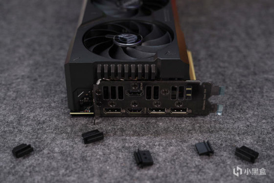 尾部接口部分,出厂带膜带防尘塞,依旧采用的是双 PCI 卡槽设计,材质为华硕显卡喜闻乐见的 304 不锈钢( 抗衰老 ),输出接口方面,提供了三个 DP1.4a 和两个 HDMI 2.1 接口 ,相比公版多增加了一个 HDMI 2.1 接口。
