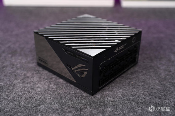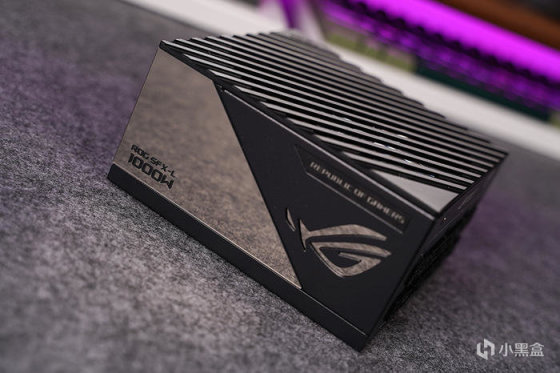 另一个侧面则为常规的磨砂颗粒面工艺,左上角 1200W 及 REPUBLIC OF GAMERS 铭牌标语标注,右边败家眼,延续一刀流切割的视觉元素,切割线条采用凹面处理。