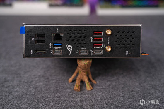 一体式 I/O 挡板,对应里头风扇带有通风网孔,接口部分从左到右分别给到有 HDMI 视频接口、两个 USB 2.0 接口、2.5G LAN 接口、蓝色 USB 3.2 GEN1 接口、两个雷电 4 Type-C 接口、三个红色 10GB USB 3.2 GEN2 接口、20GB USB 3.2 Gen2×2 Type-C 接口(用于外接 ROG STRIX HIVE )、WiFi 6E SMC 接口、CLEAR CMOS 按键。
