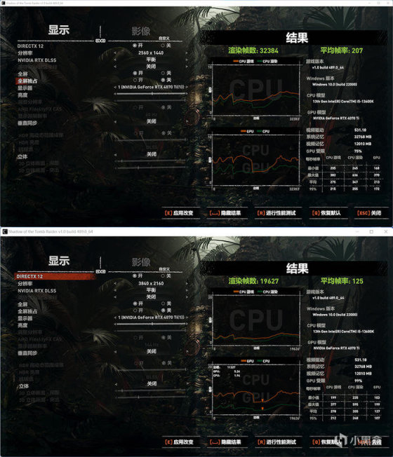 古墓丽影:暗影,开启光追,DLSS 平衡 ,极高画质,2K 分辨率,平均 207 FPS ,4K 分辨率,平均 125 FPS。