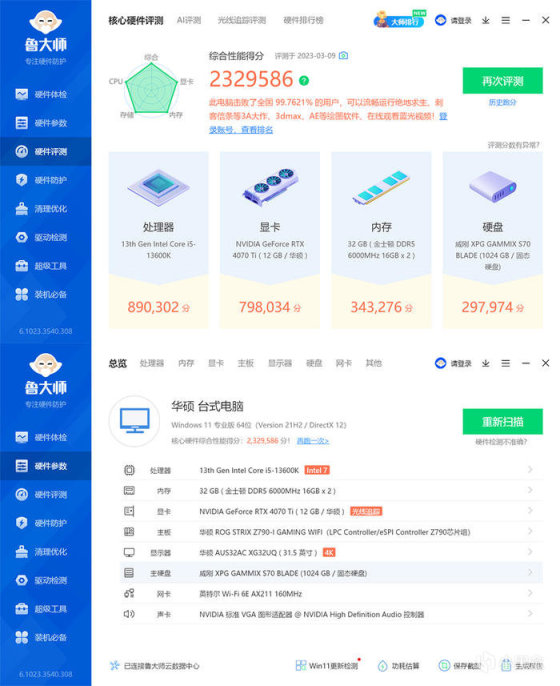 鲁大师跑分 2329586。
