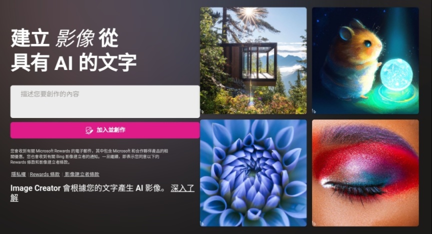 Image Creator 是可协助使用者使用 DALL-E 产生 AI 影像的产品。收到文字提示,我们的 AI 随机即会产生一组符合该提示的影像