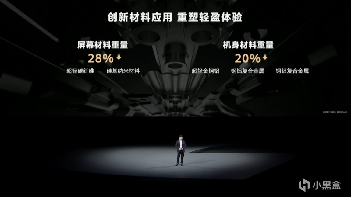 华为自研了创新材料,通过业界独有的超轻金刚铝以及碳纤维材料,实现了突破性减重,将屏幕减重28%、机身材料减重20%!