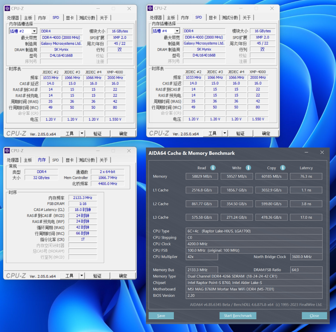 OC至4266MHz后,内存读取速度为58829 MB/s,写入速度为59527 MB/s,复制速度为60185 MB/s,延时为76.3 ns;