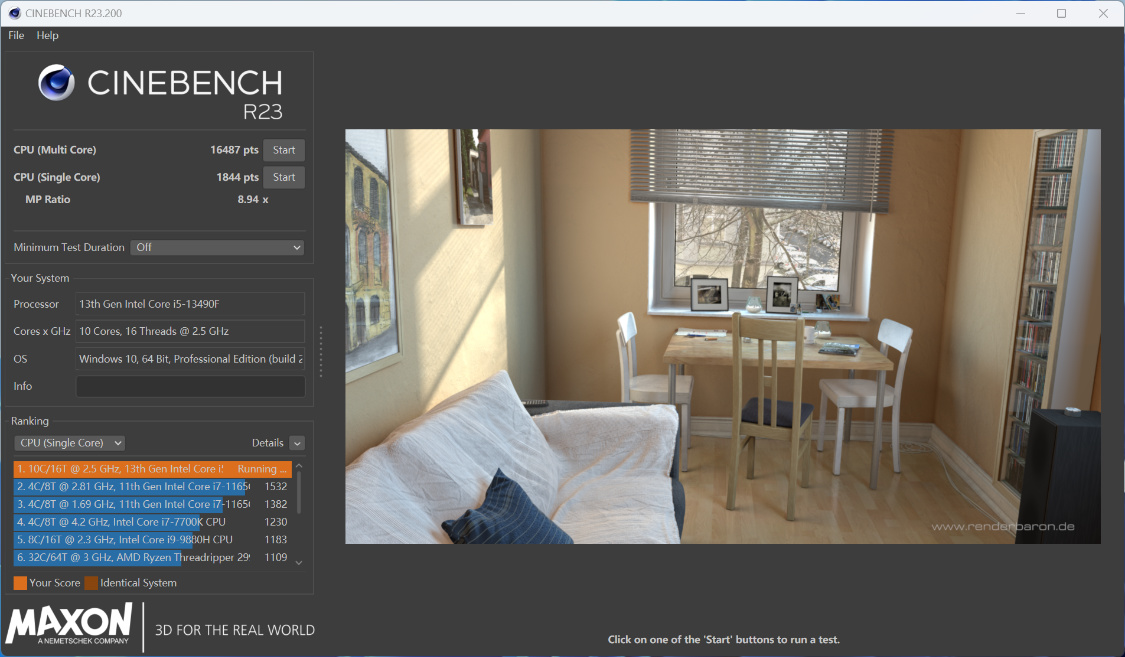 CineBench R23 基准测试,单核得分1844pts,单核得分16487pts;