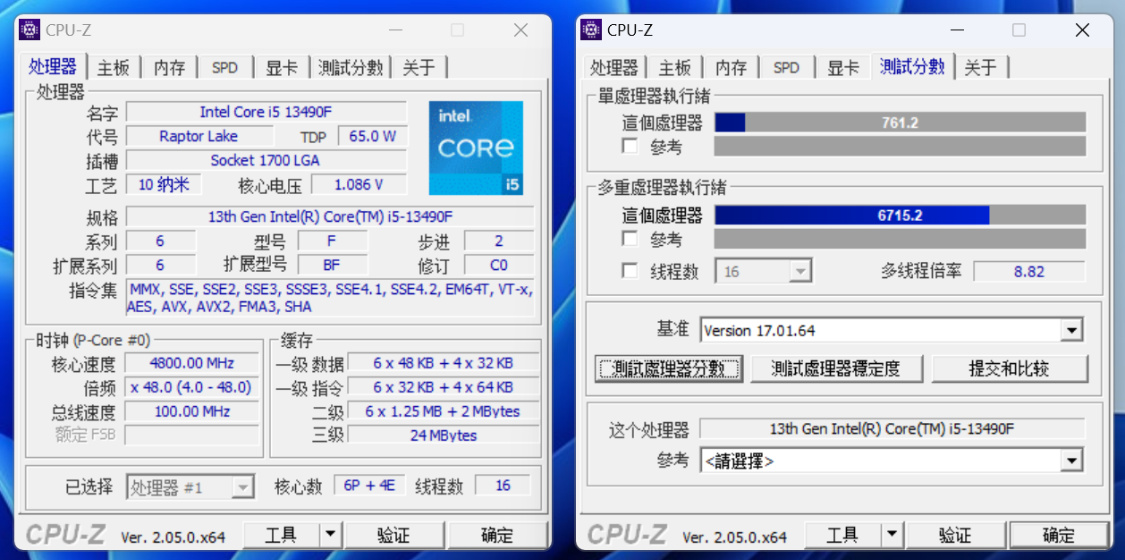 CPU-Z基准测试,单核得分761.2,多核得分6715.2;