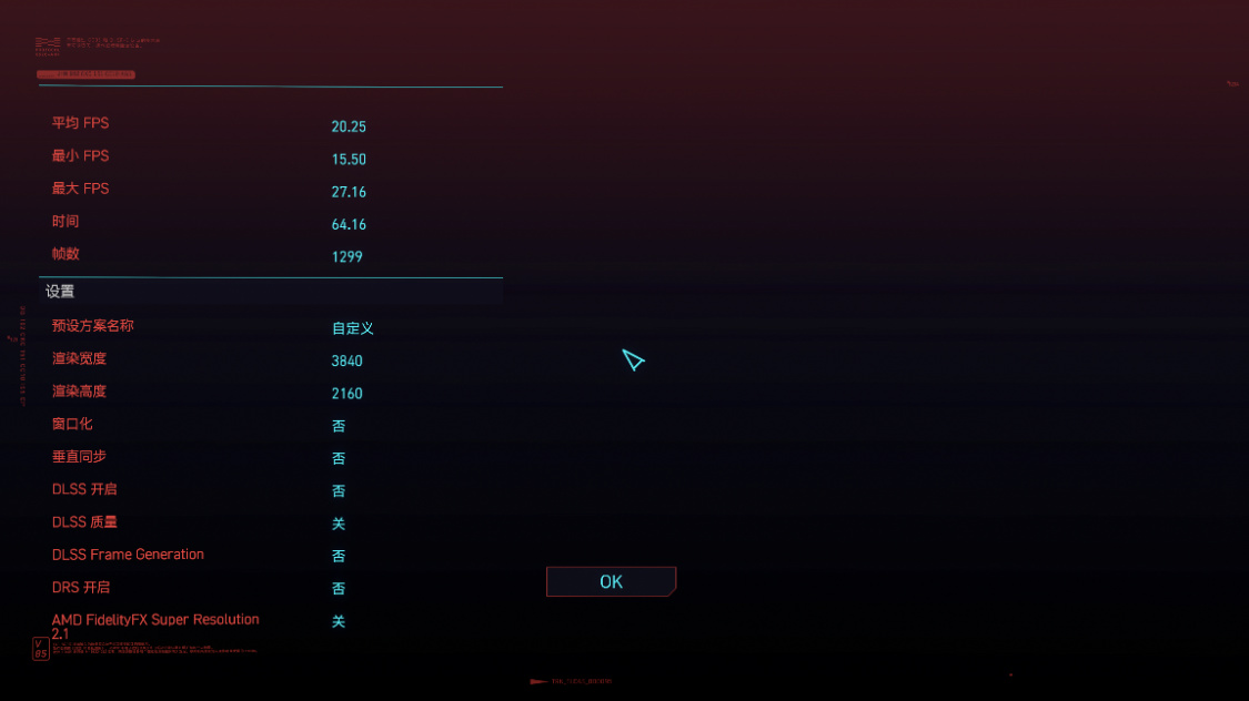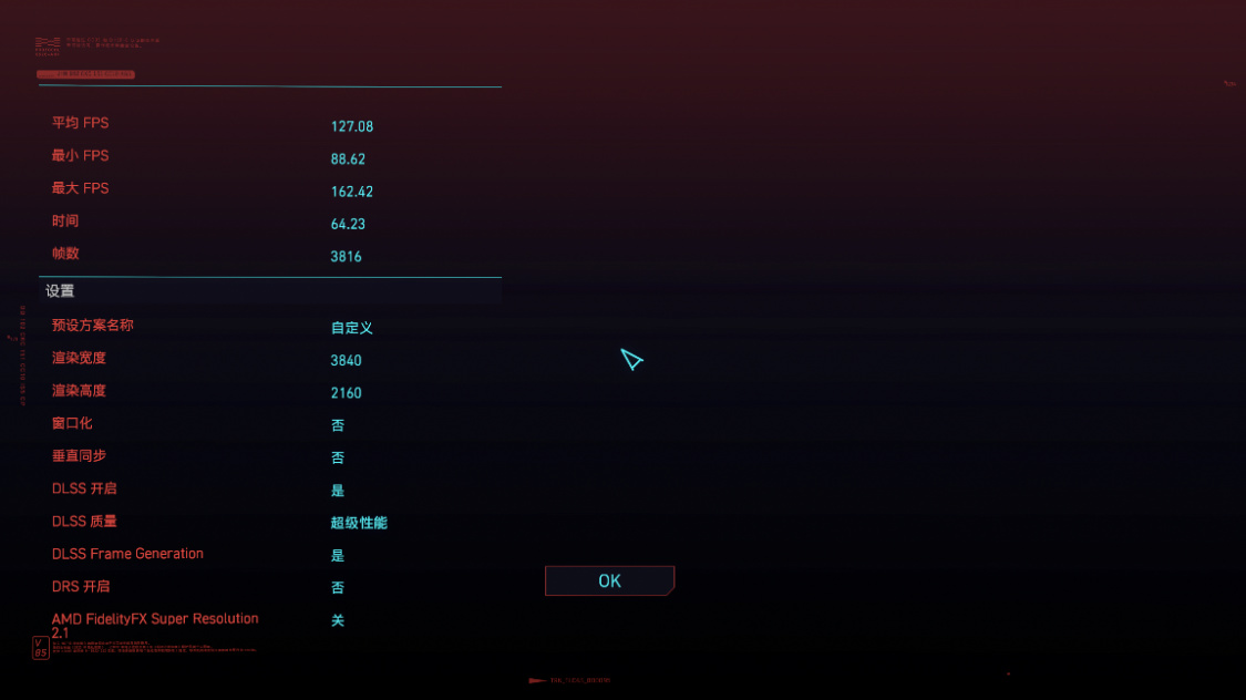 《赛博朋克2077》画质超级,光追变态档位,4K分辨率下,关闭DLSS时,游戏的实际帧率约为20.25FPS左右。开启超级性能模式下的DLSS 2.0后,游戏实际帧率约为90.99FPS左右。继续开启DLSS 3.0后,游戏实际帧率约为127.08FPS左右;