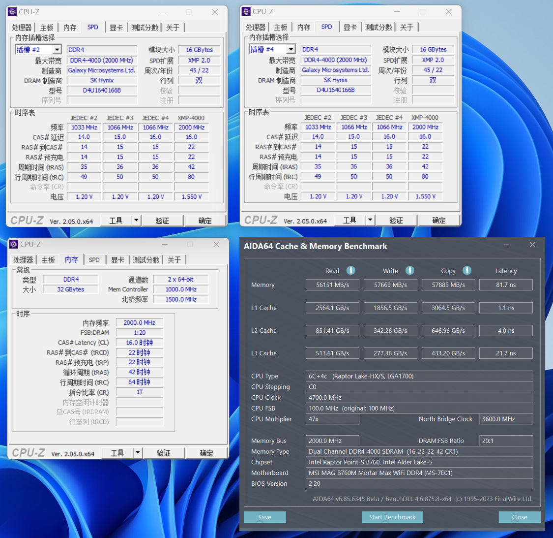 XMP至4000Mhz后,内存读取速度为56151 MB/s,写入速度为57669 MB/s,复制速度为57885 MB/s,延时为81.7 ns;