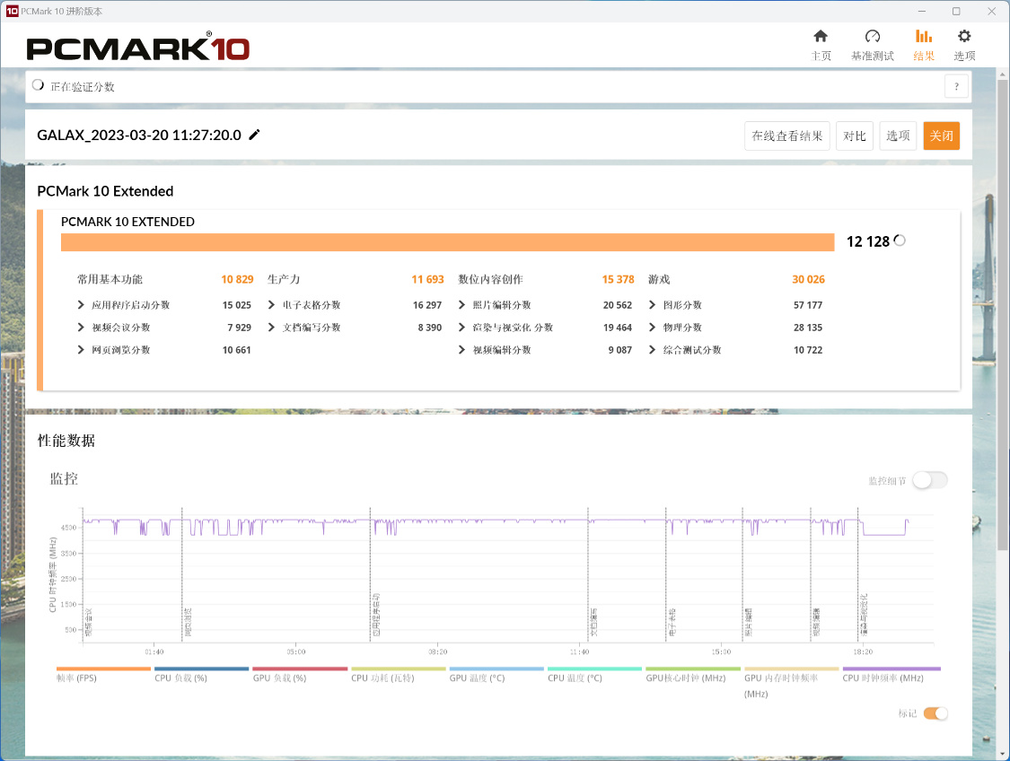 PC Mark Extended整机测试,整机得分12128分,常用基本功能得分10829分,生产力得分11693分,数位内容创作得分15378分,游戏得分30026分;