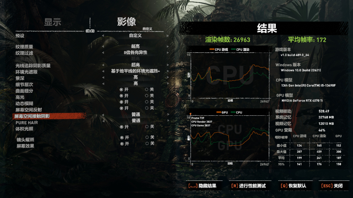 《古墓丽影·暗影》画质最高,光追超高,DLSS超强性能,4K分辨率下,游戏平均帧率为172FPS,2K分辨率下,游戏平均帧率为190FPS;