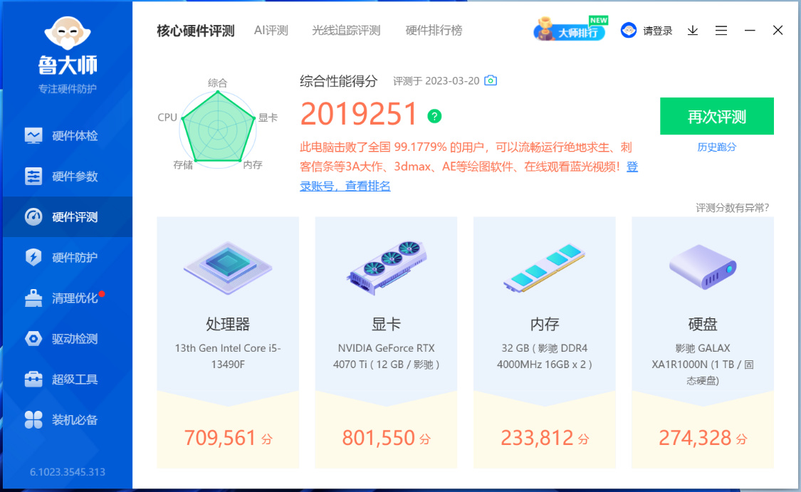 鲁大师整机得分201W分,就这也能领先99%的玩家?