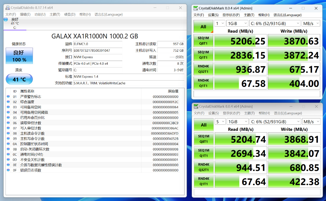 新盘,还得跑个CrystalDiskMark持续读写测试,硬盘的最大读取速度为5206.25MB/s,写入速度为3870.63MB/s
