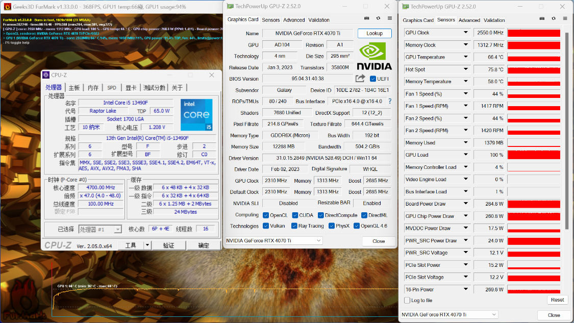FurMark烤机测试,机箱内环境,烤机15Min,显卡温度为66°左右,显卡功耗为285W左右;