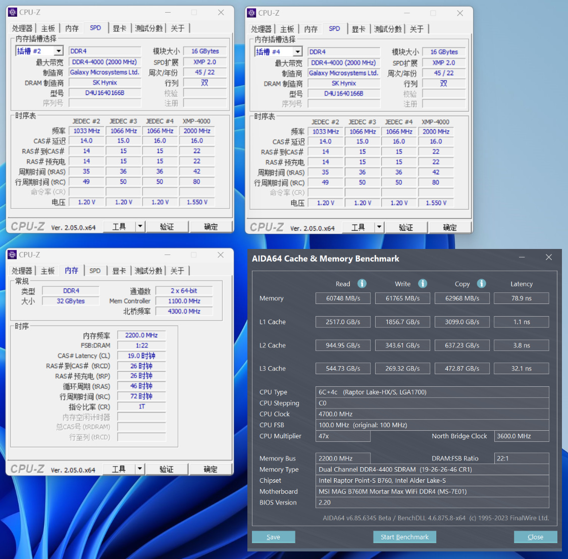 OC至4400MHz,内存读取速度为60748 MB/s,写入速度为61765 MB/s,复制速度为62968 MB/s,延时为78.9 ns;