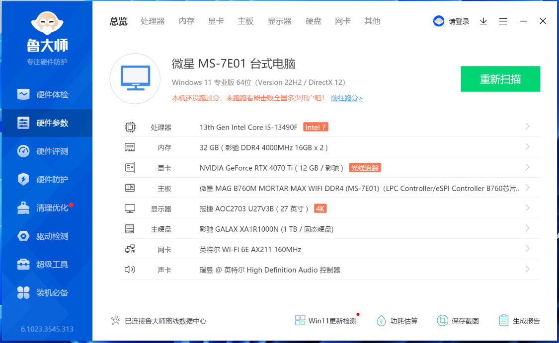 最终他买来的配置明细:i5-13490F处理器、微星MAG B760M MAX迫击炮 WIFI DDR4主板、影驰HOF Classic DDR4-4000MHz 16G*2内存、影驰星曜X4 Pro 1T M.2固态硬盘、影驰RTX 4070Ti 星曜OC显卡、影驰魔影360R一体式水冷、影驰Touch(触觉)黑橙机箱、安钛克HCG 750金牌全模组电源、影驰流影E3散热风扇*8...(先别着急骂我,这可不是我推荐的)