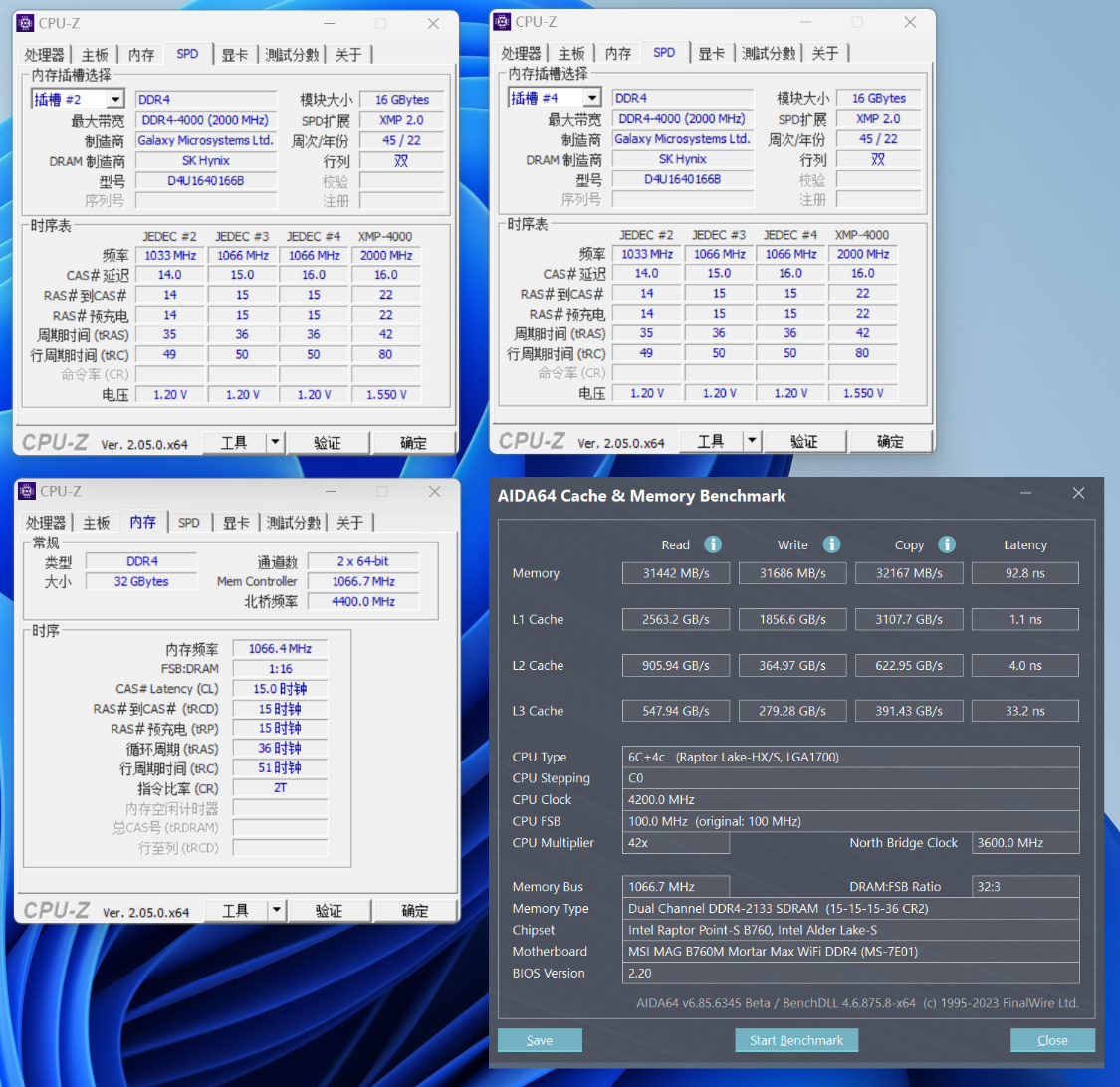 内存默频状态下,读取速度为31442 MB/s,写入速度为31686 MB/s,复制速度为32167 MB/s,延时为92.8 ns;
