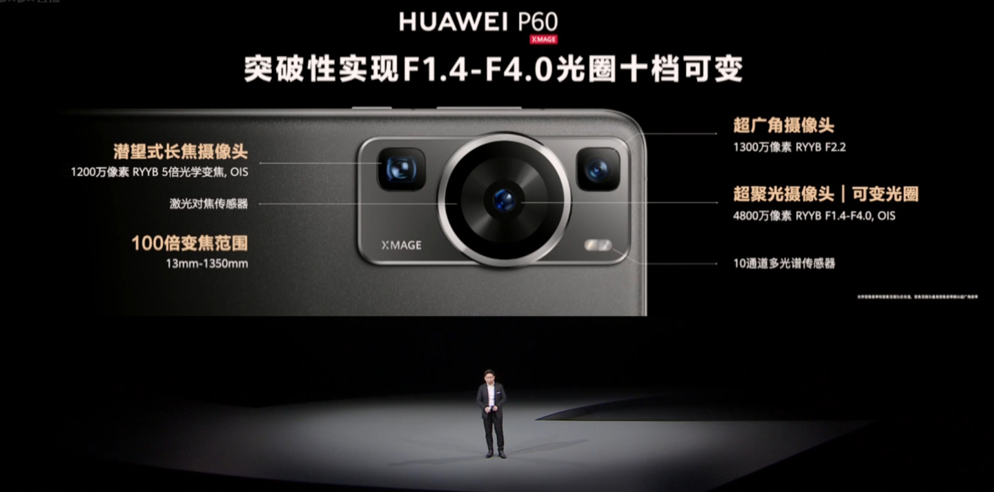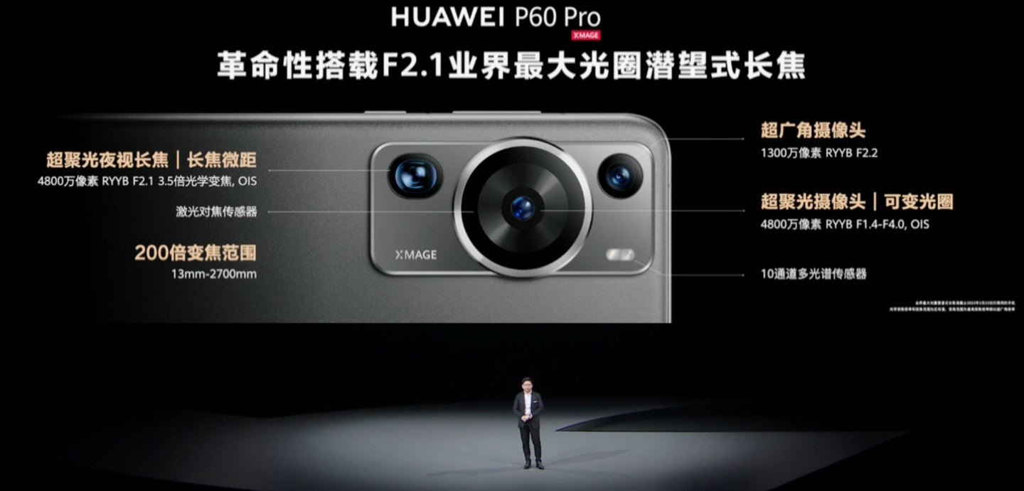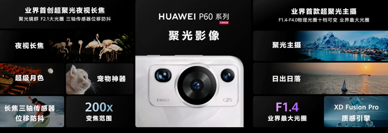 影像方面,華爲P60系列業界首創超聚光主攝(4800 萬像素),支持 F1.4-F4.0 十檔物理光圈智能可變,進光量與業界旗艦手機iPhone 14 Pro Max相比提高了 191%,搭配全新 XD Fusion Pro 質感引擎,可清晰捕捉暗夜微光。P60 的另外兩顆攝像頭是 1300 萬像素的超廣角攝像頭(RYYB F2.2)和 1200 萬像素潛望式長焦攝像頭(RYYB,支持 5 倍光學變焦、OIS)。