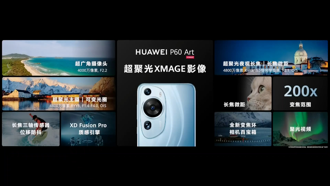 會上華爲還發布了華爲 P60 Art“超大杯”,該機爲華爲巴黎美學研究所設計,採用不規則攝像頭設計,靈感來自於海島,提供流沙金、蔚藍海 2 種配色。相比 P60 Pro,該機的超廣角攝像頭升級到了 40MP f / 2.2,電池升級到了 5100mAh 硅碳負極電池,其它配置則跟 Pro 機型保持一致。