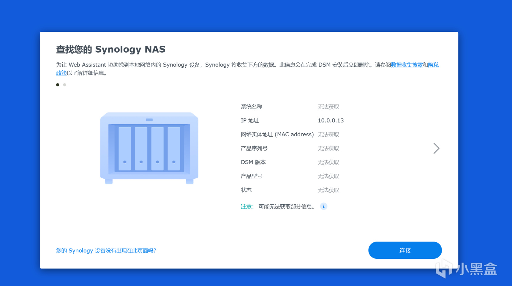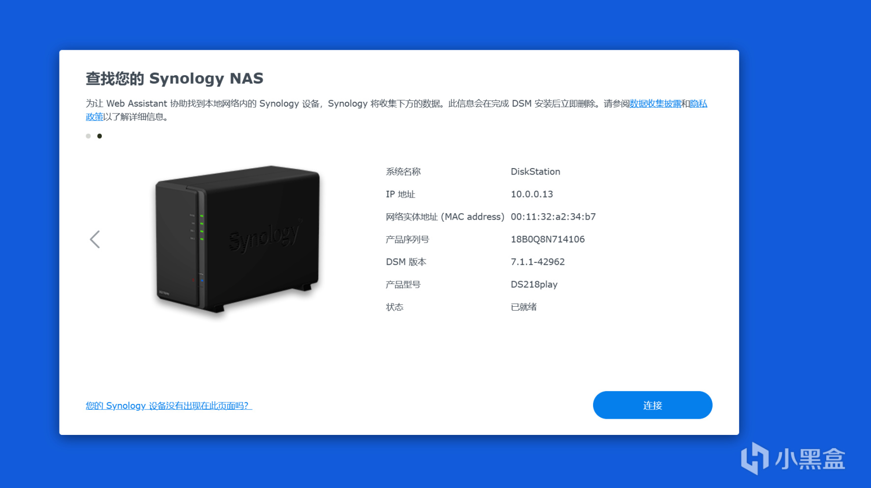 使用相同局域网下的另一台电脑,下载安装Synology Assistant软件搜索设备并联机,或者直接浏览器中输入http://192.168.1.18:5000/网址。