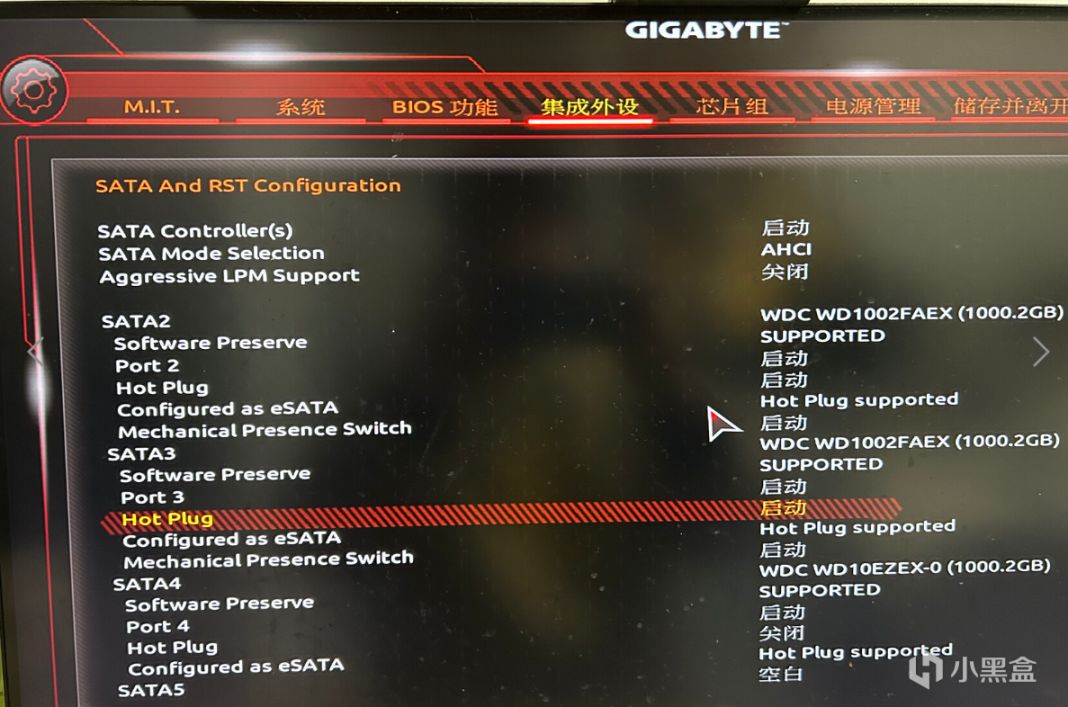 重新将黑群晖系统U盘接到NAS电脑上,按DEL进入BIOS,先到集成外设—SATA And RST Configuration设置中把SATA硬盘的Hot Plug热插拔功能打开,建议四个接口全部打开。
