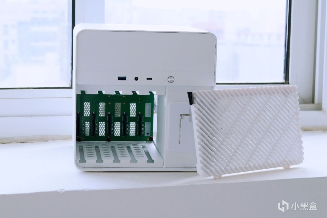 打开前置的磁吸通风网格栅,是五个硬盘位,可以满足未来的硬盘扩展需求。