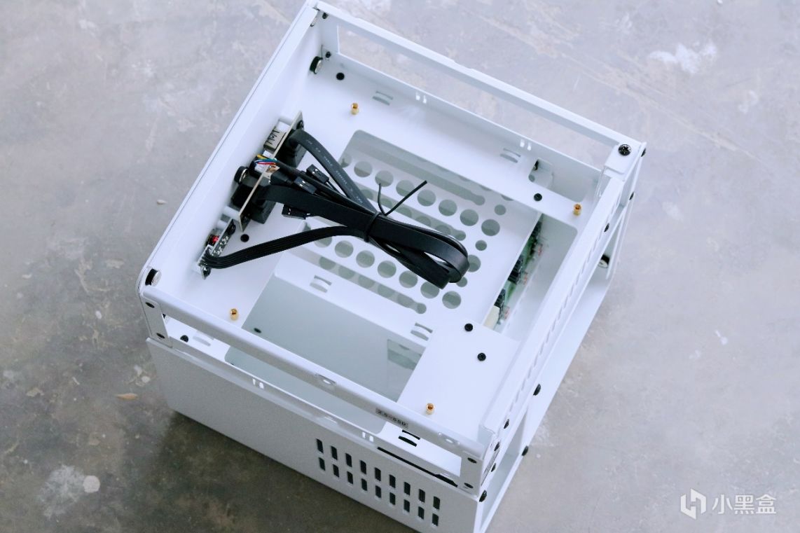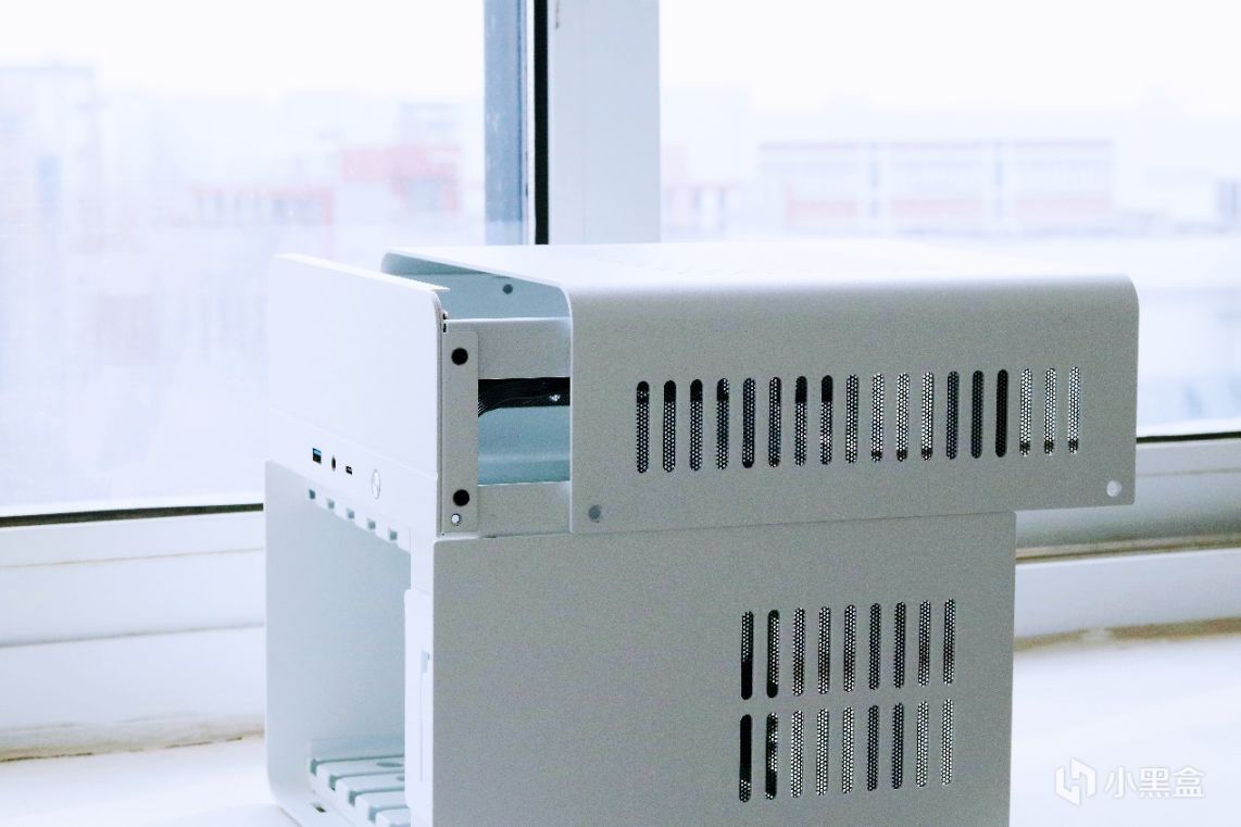 绕到背部,机箱上下分仓设计就更为明显,上半部分是用来安装主板,左侧是用来固定SFX尺寸的电源,右侧则是SATA扩展板。