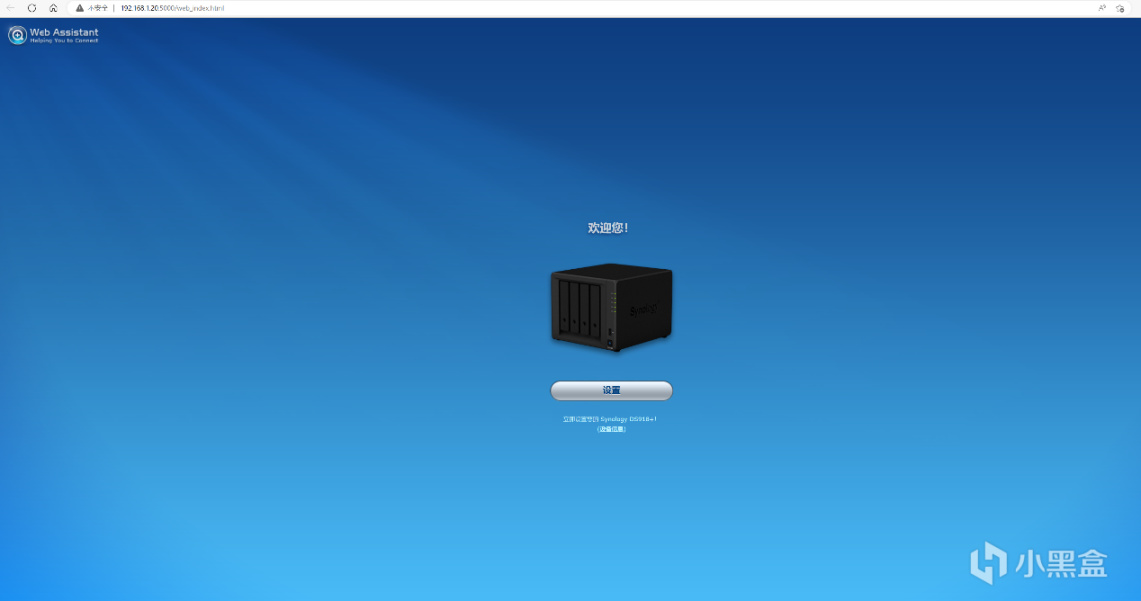 正确连接后,会显示欢迎界面,如图,点击设置,然后选择手动安装,将百度云下载的SM_DS918+_25423.pat选中,点击安装。