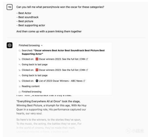 以近期熱點第九十五屆奧斯卡頒獎典禮爲例,此前ChatGPT像個深山老漢一樣對當下的事情一問三不知,如今的ChatGPT輕鬆聯網找到完整的獲獎名單,甚至還可以讓它將寫一首詩歌這些信息聯繫起來。