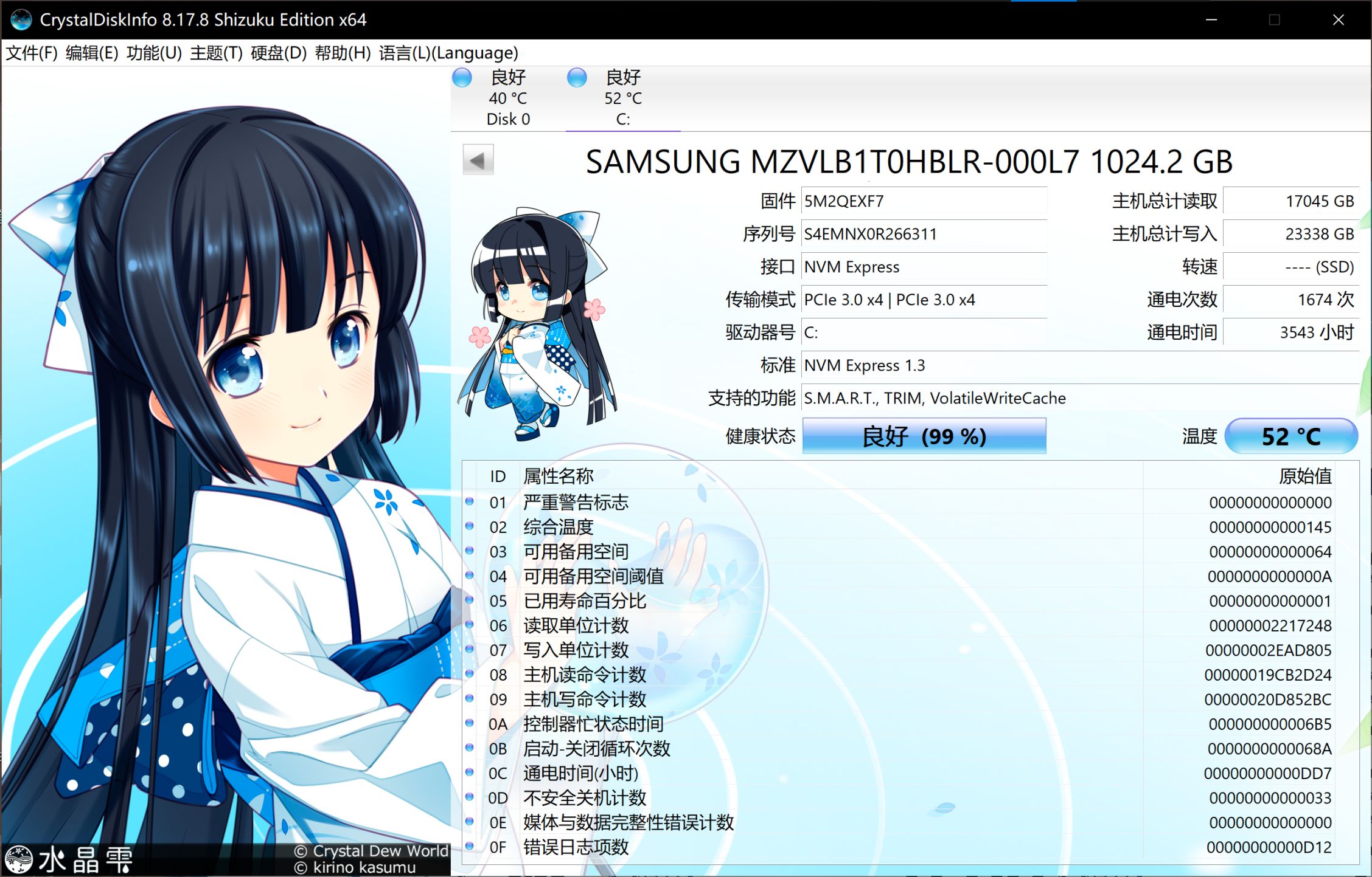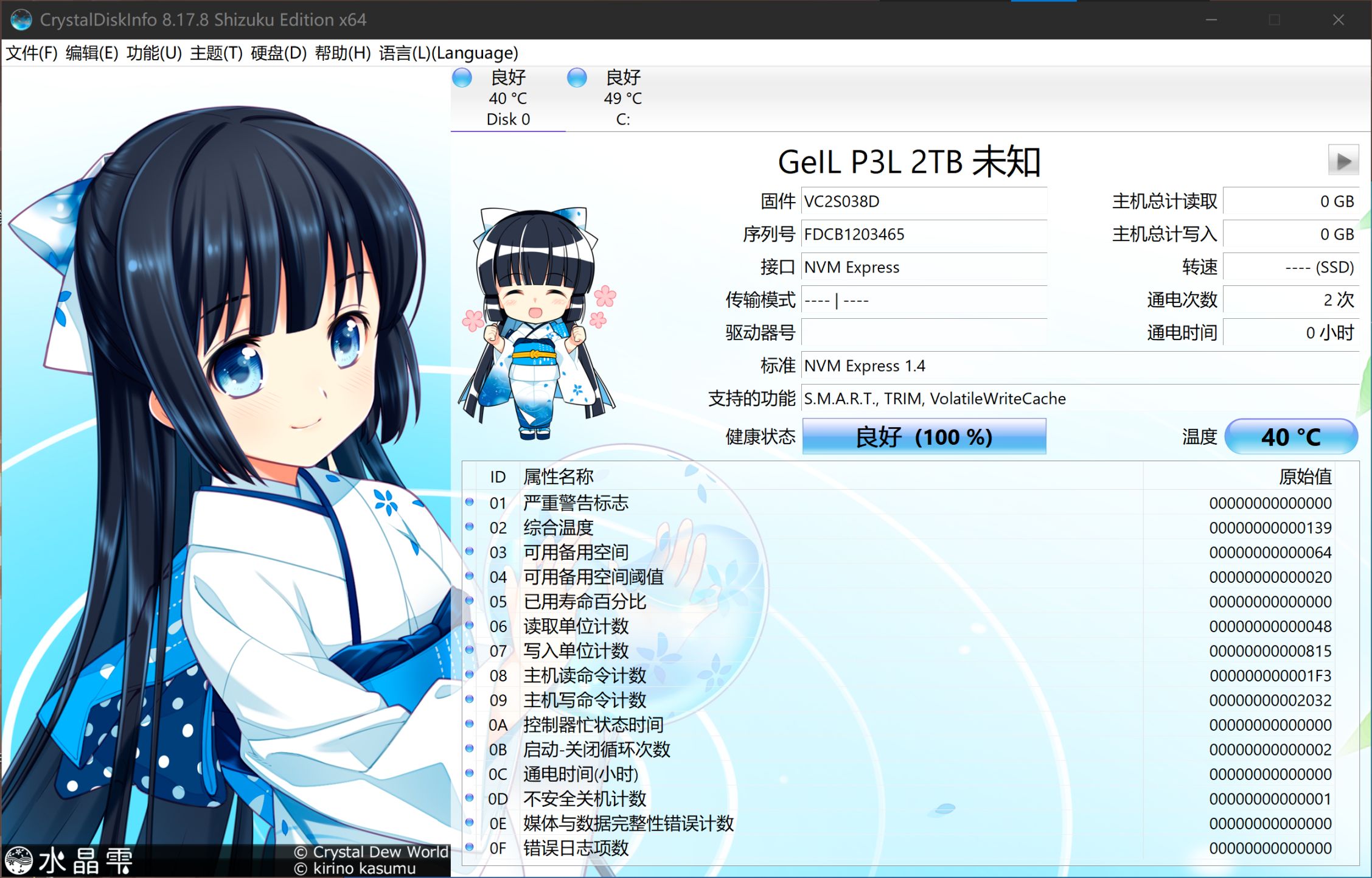 2.使用crystal deskinfo(网址放在评论区,或者图吧工具箱里有)这里可以看到硬盘更详细数据,这里主要看一下健康程度,通电次数和通电时间,支持的功能(smart和trim等协议应该都有),总写入读取量,温度等。可见金邦这款健康程度是100%,通电时间只有两次,通电时间也是0,等我一会向她体内狠狠地注入数据。不过金邦的这款硬盘的温度不是真正温度,不知道是咋回事。