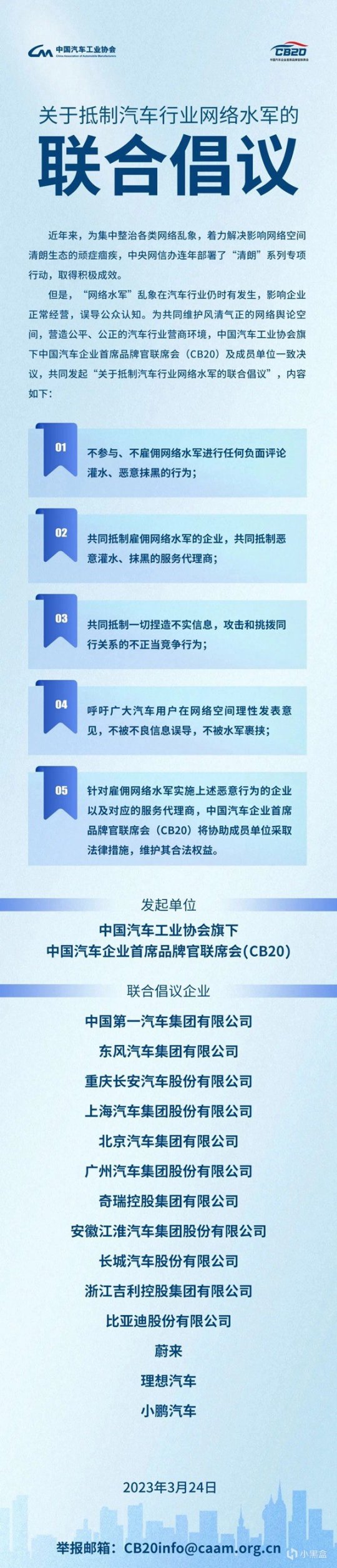 但是,“網絡水軍”亂象在汽車行業仍時有發生,影響企業正常經營,誤導公衆認知。爲共同維護風清氣正的網絡輿論空間,營造公平、公正的汽車行業營商環境,中國汽車工業協會旗下中國汽車企業首席品牌官聯席會(CB20)及成員單位一致決議,共同發起“關於抵制汽車行業網絡水軍的聯合倡議”,內容如下: