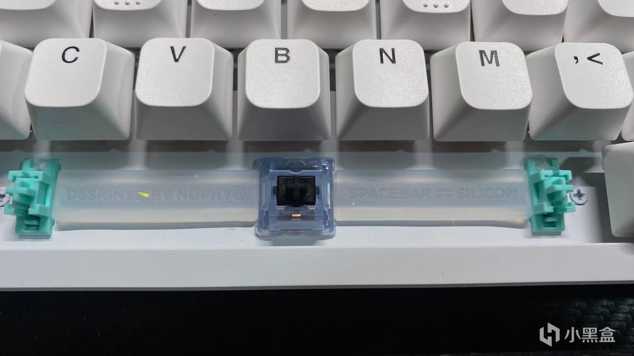 空格地方設計是真的不錯的,空格中間菊花處搞了兩個減震墊,這個墊子能消除一部分的雜音,可以讓鍵盤的聲音變小,這個處理方式是很好的,據我所知市面上好像就他一家。