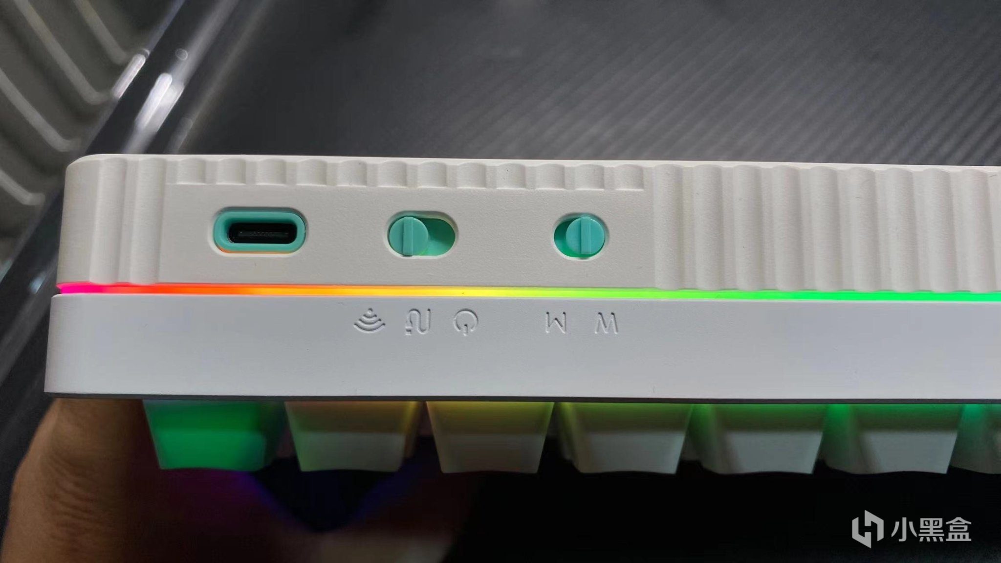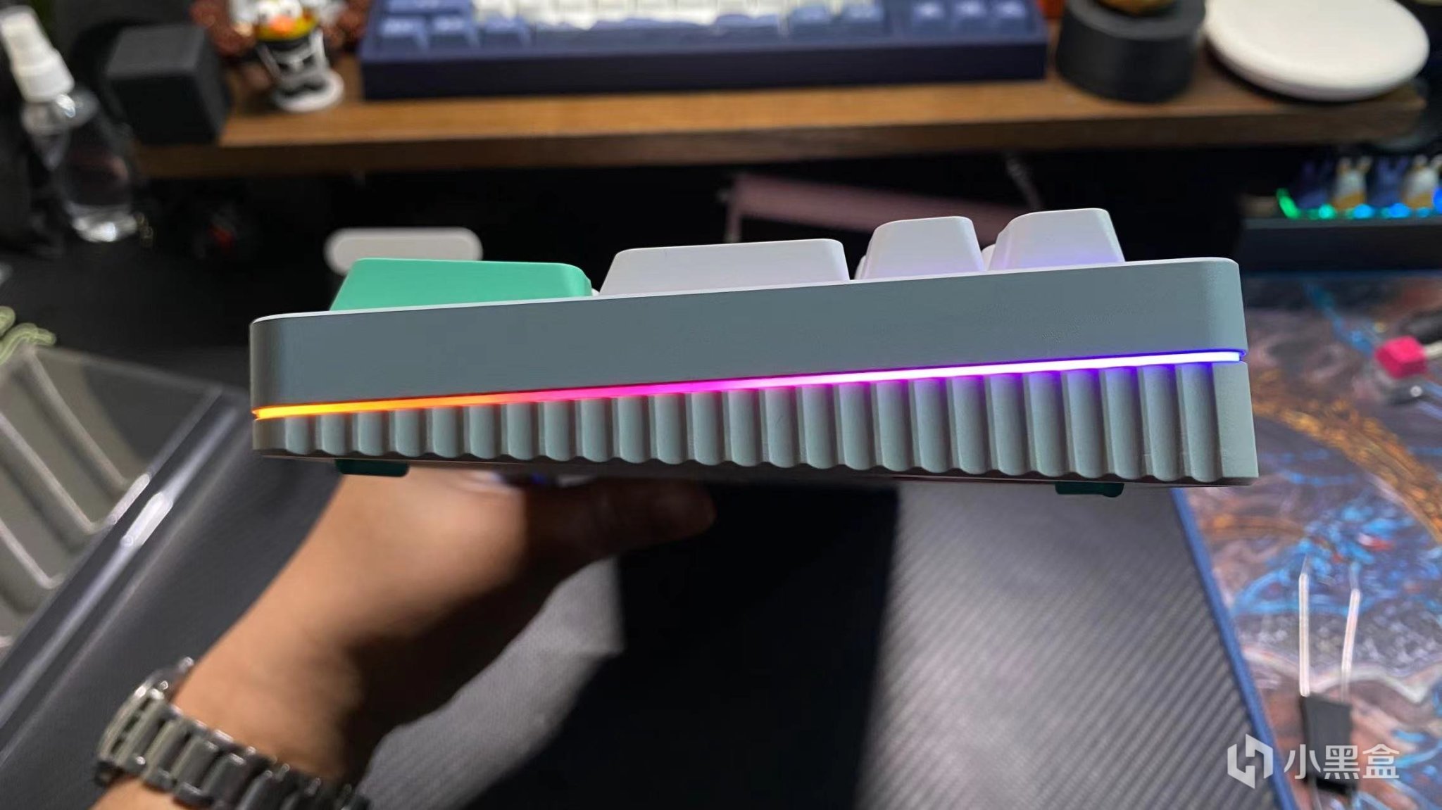 pcb採用的是一個上燈位,燈光亮度不錯,四周也設置了一圈氛圍燈,可以從鍵盤的側邊漏出來,但是這也是一個問題,因爲加了一圈燈,就會讓鍵盤的續航降低,這優劣並存吧,還是可以的。
