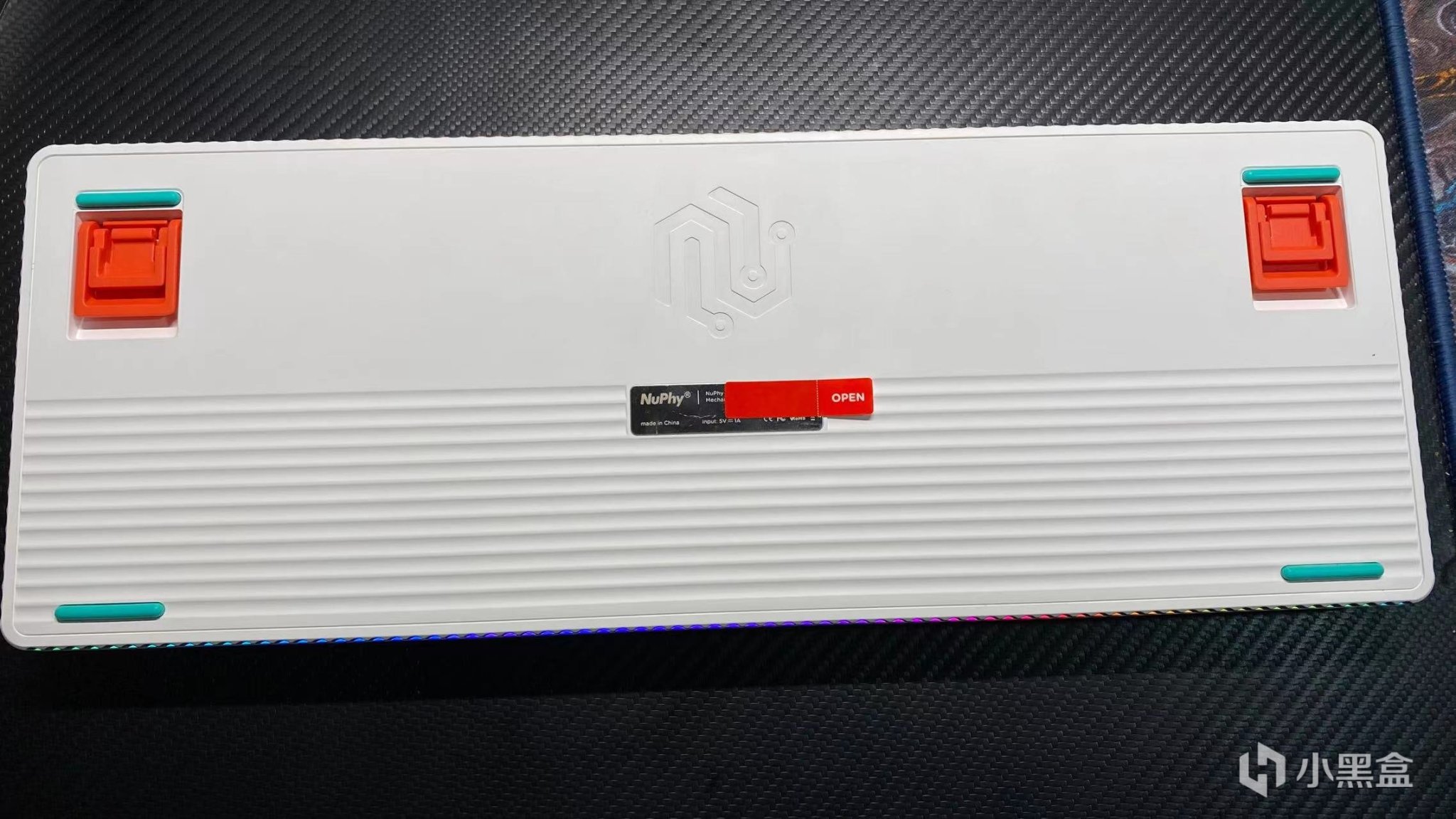 鍵盤背面就是一個兩段式腳撐,產品的logo以及一塊金屬銘牌;背面也是有一定設計的,就比如在中間的哪個logo設計以及兩邊教程做了一個撞色的設計,下方做了一個波浪的設計(雖然很像搓衣板。。。)