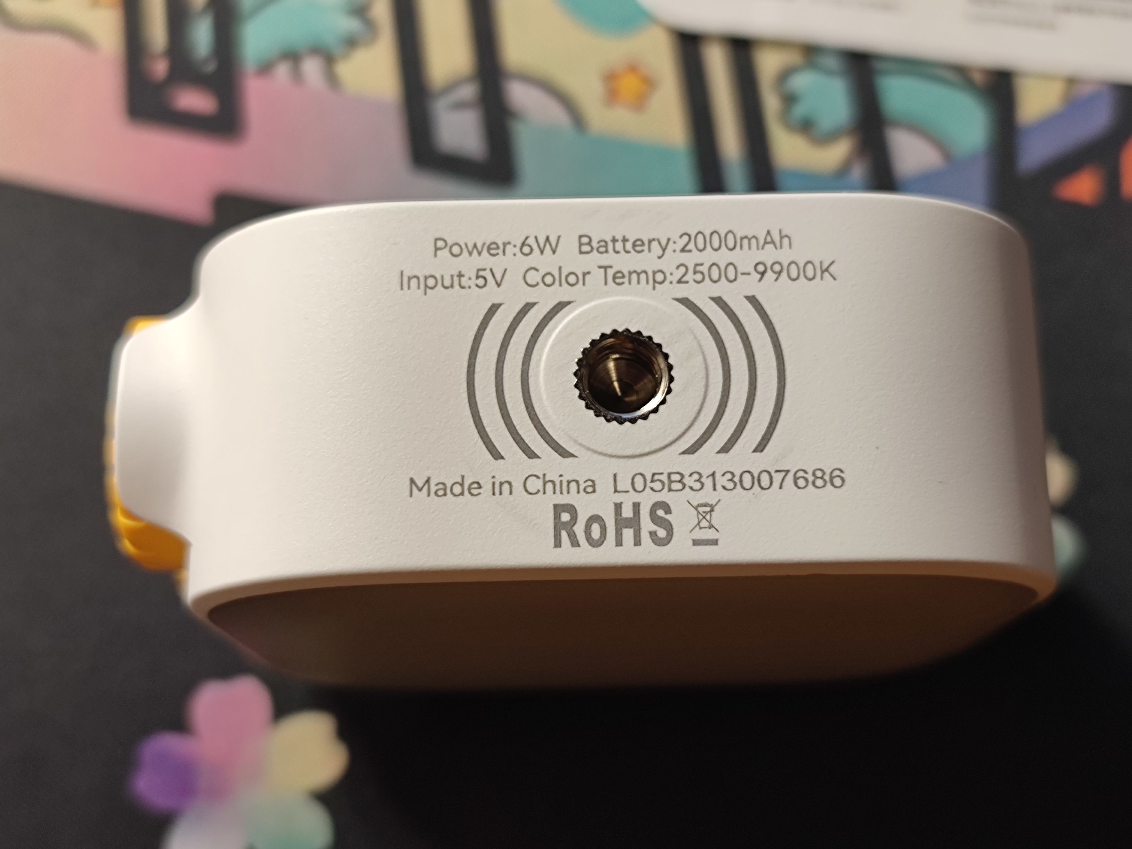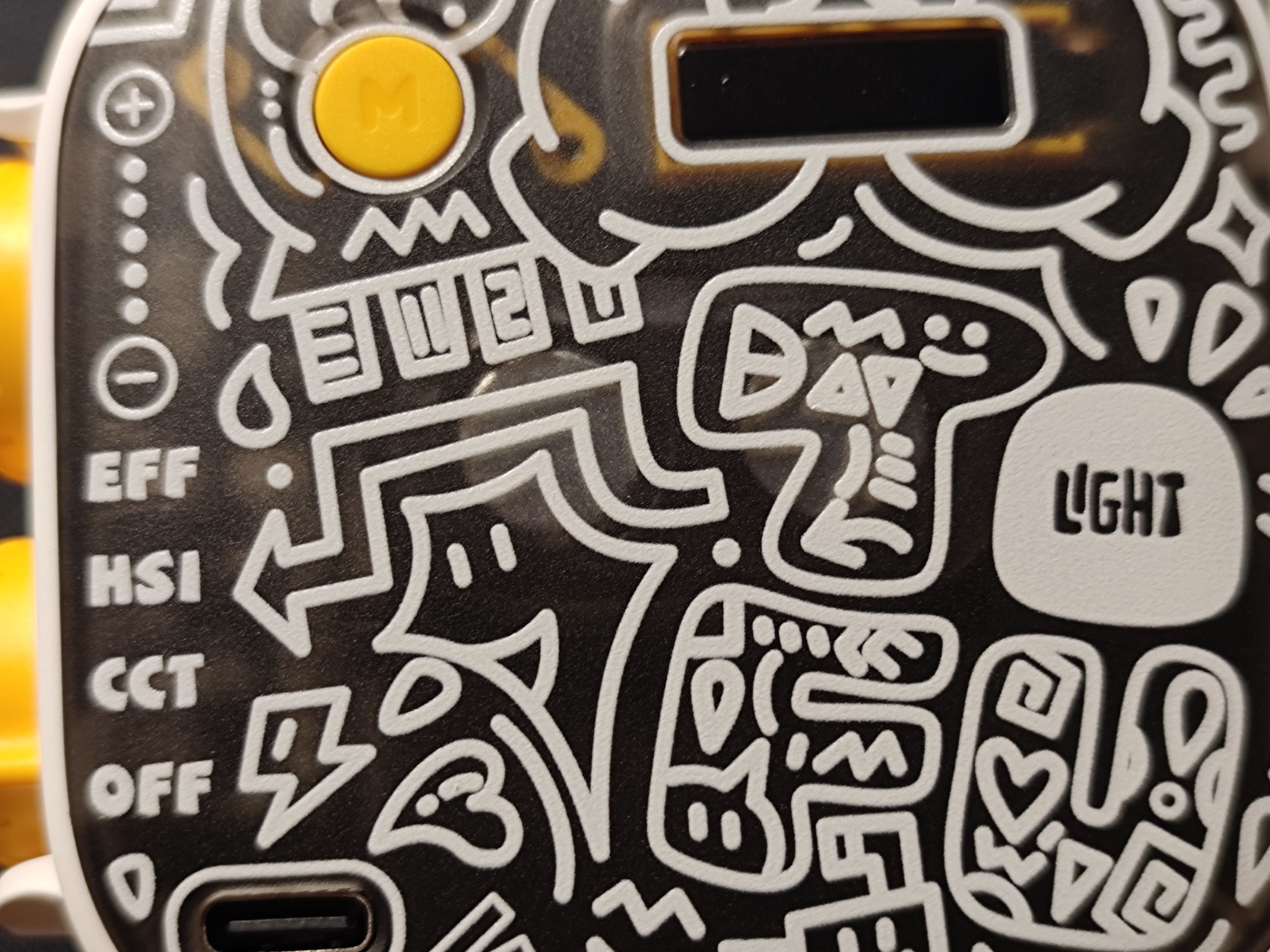 在其左側的塗鴉上則是分出一塊區域做了功能標識,從上到下依次對應着側方旋鈕的功能。其他區域則就是圖案以及右下角一大塊比較難以辨識的“TOFU”字樣(個人感覺),整體看來十分花裏胡哨。而在這些花裏胡哨的圖案之下隱藏的就是複雜的內部結構,最顯眼的莫過於中間的兩個磁鐵,方便在不方便手持的情況下吸到別的地方進行補光。