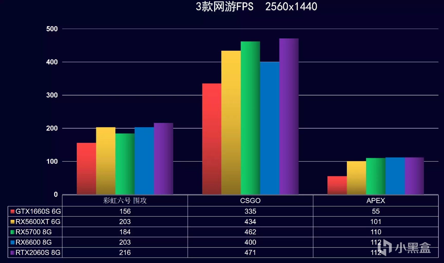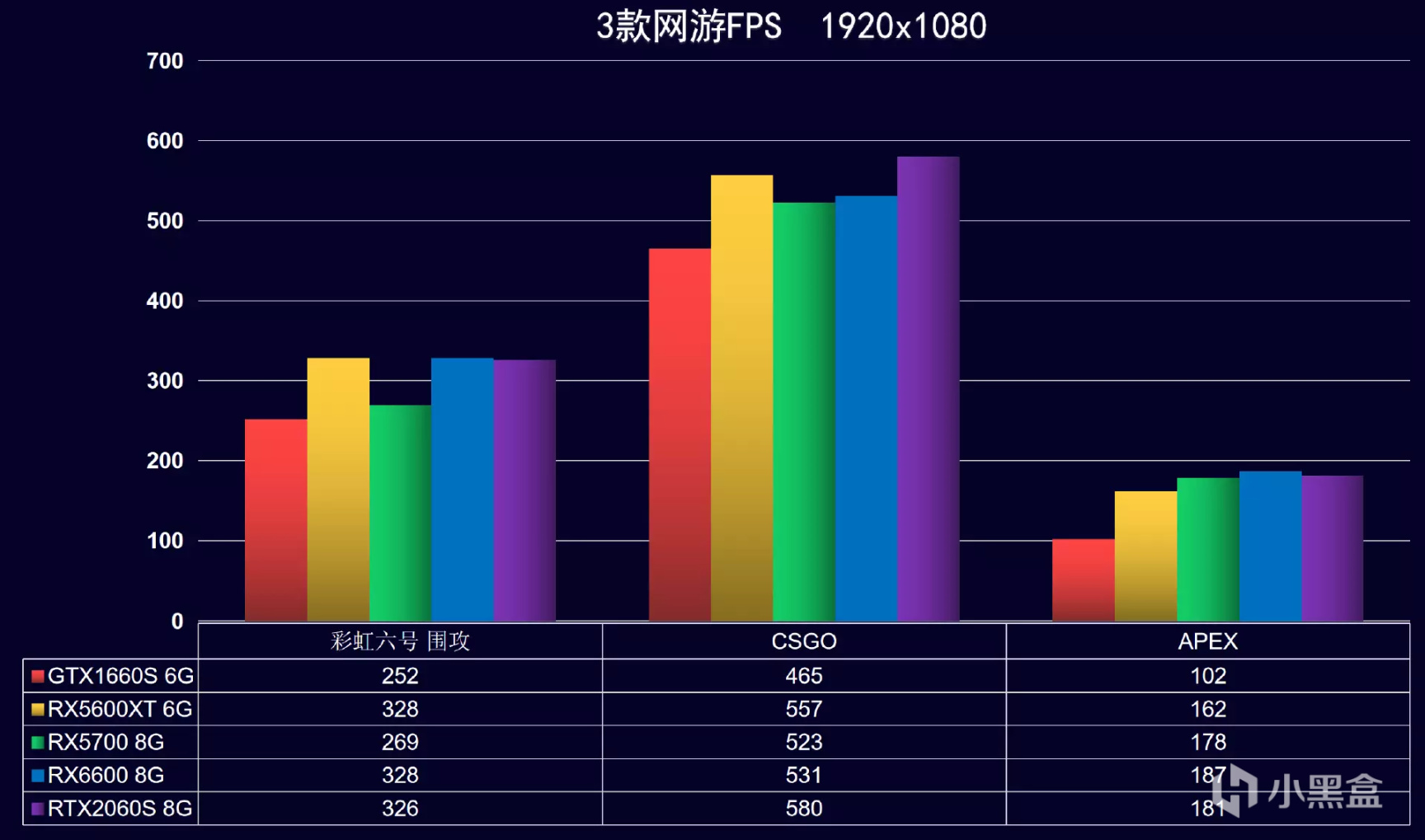 彩虹六號和CSGO使用遊戲自帶Benchmark測試,除1660super之外,其餘4張顯卡表現差不多。