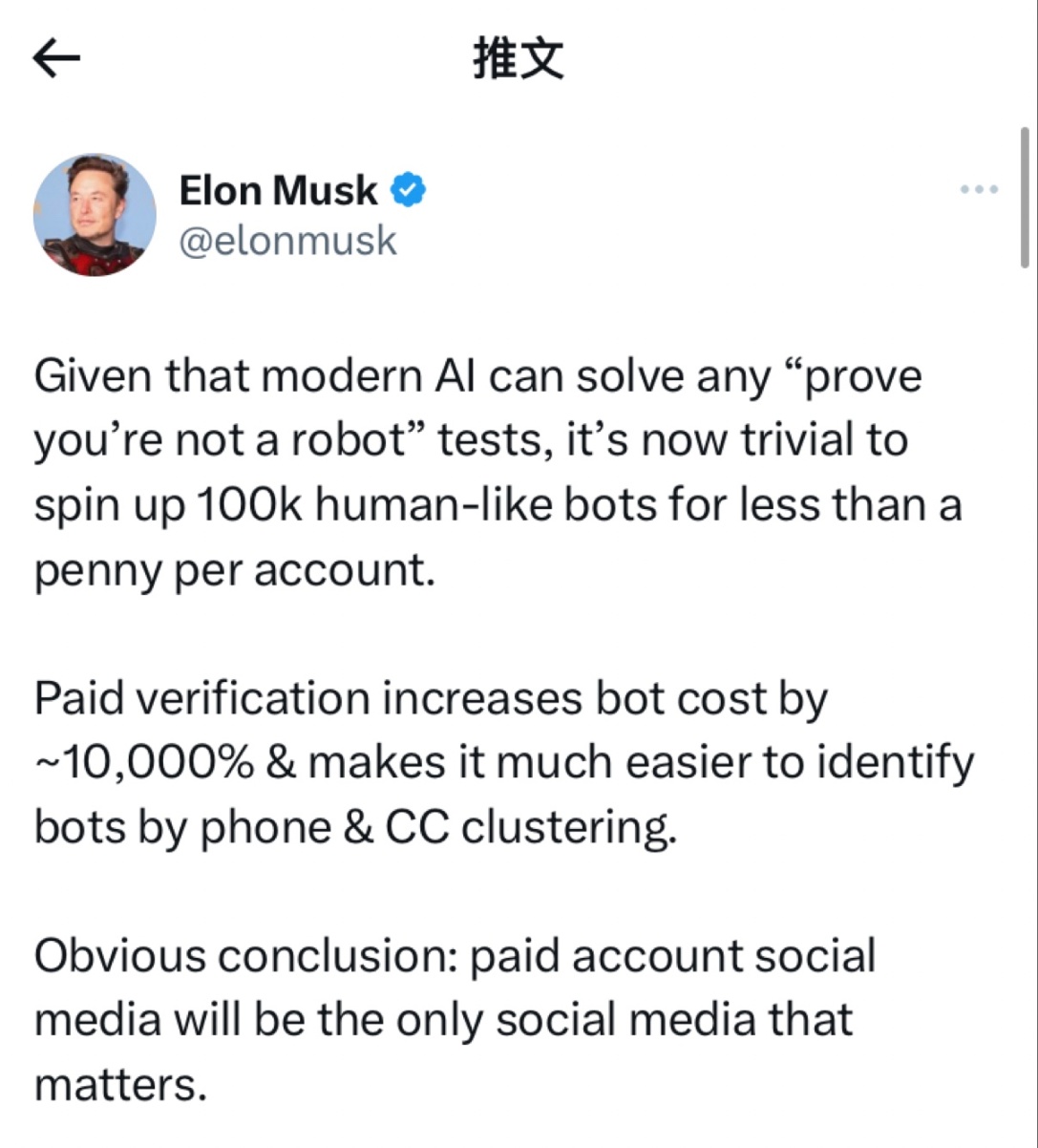 馬斯克發推說:鑑於現代人工智能可以解決任何“證明你不是機器人”的測試,現在以每個帳戶不到一美分的價格啓動 10 萬個類人機器人是微不足道的。